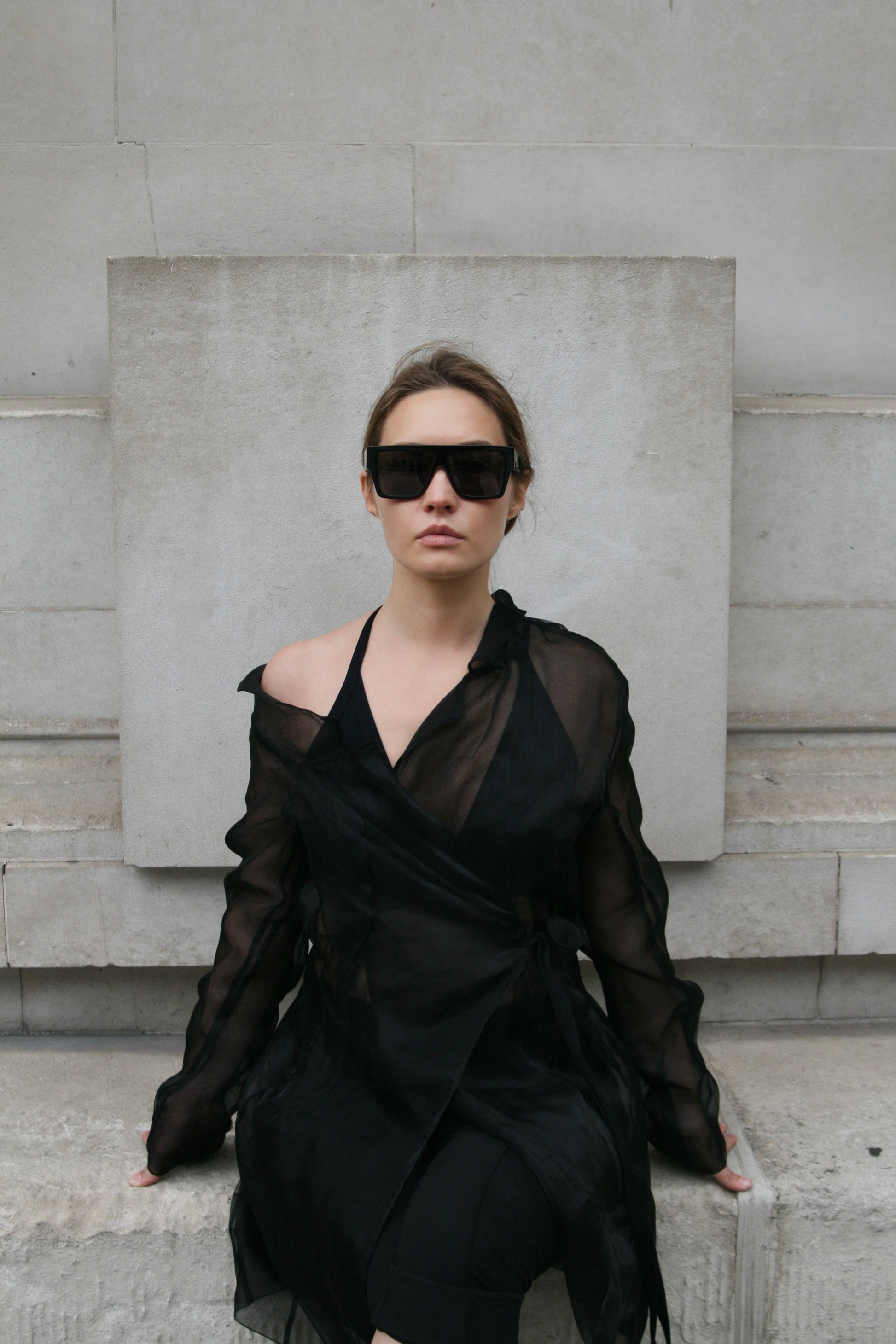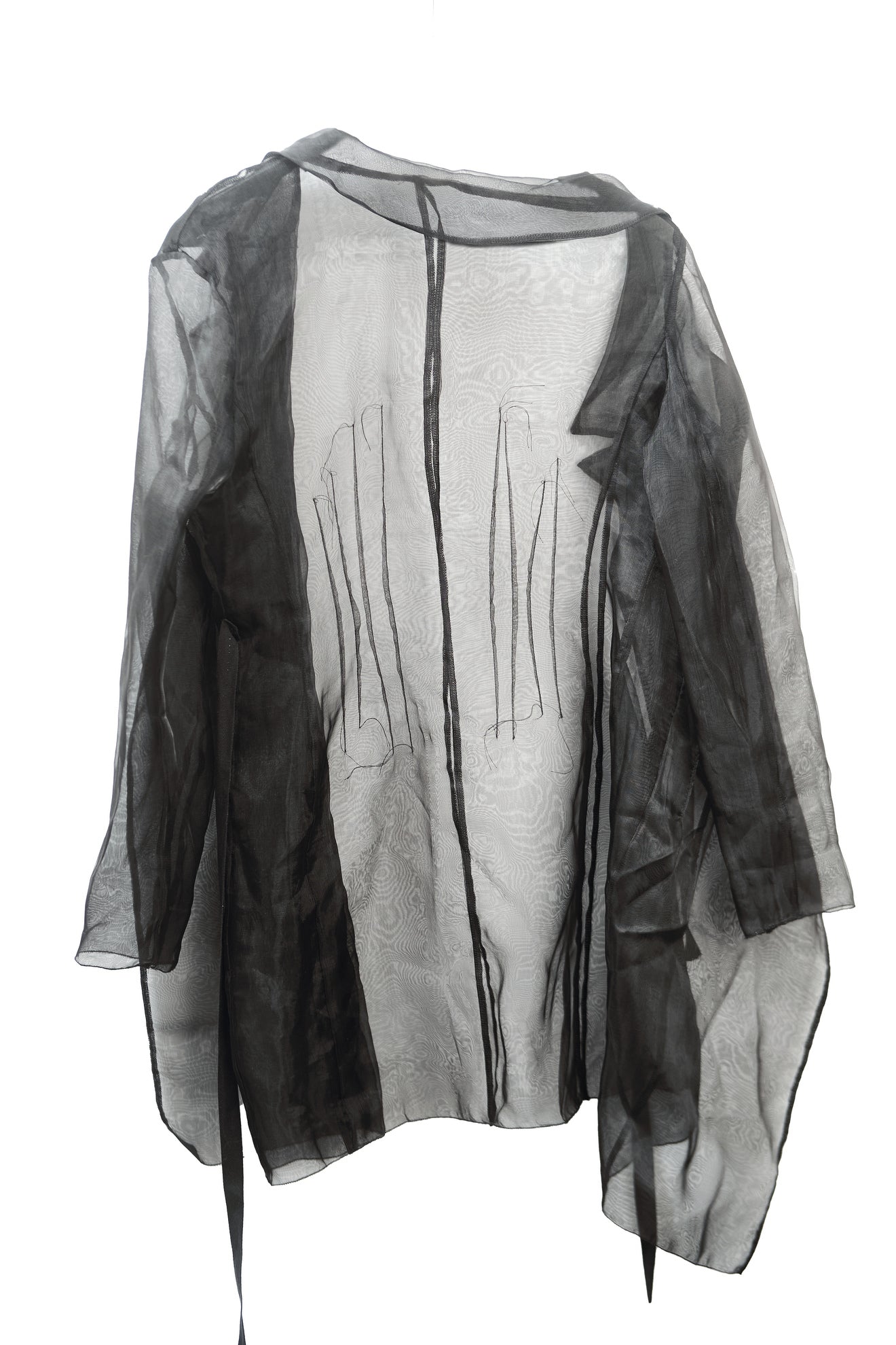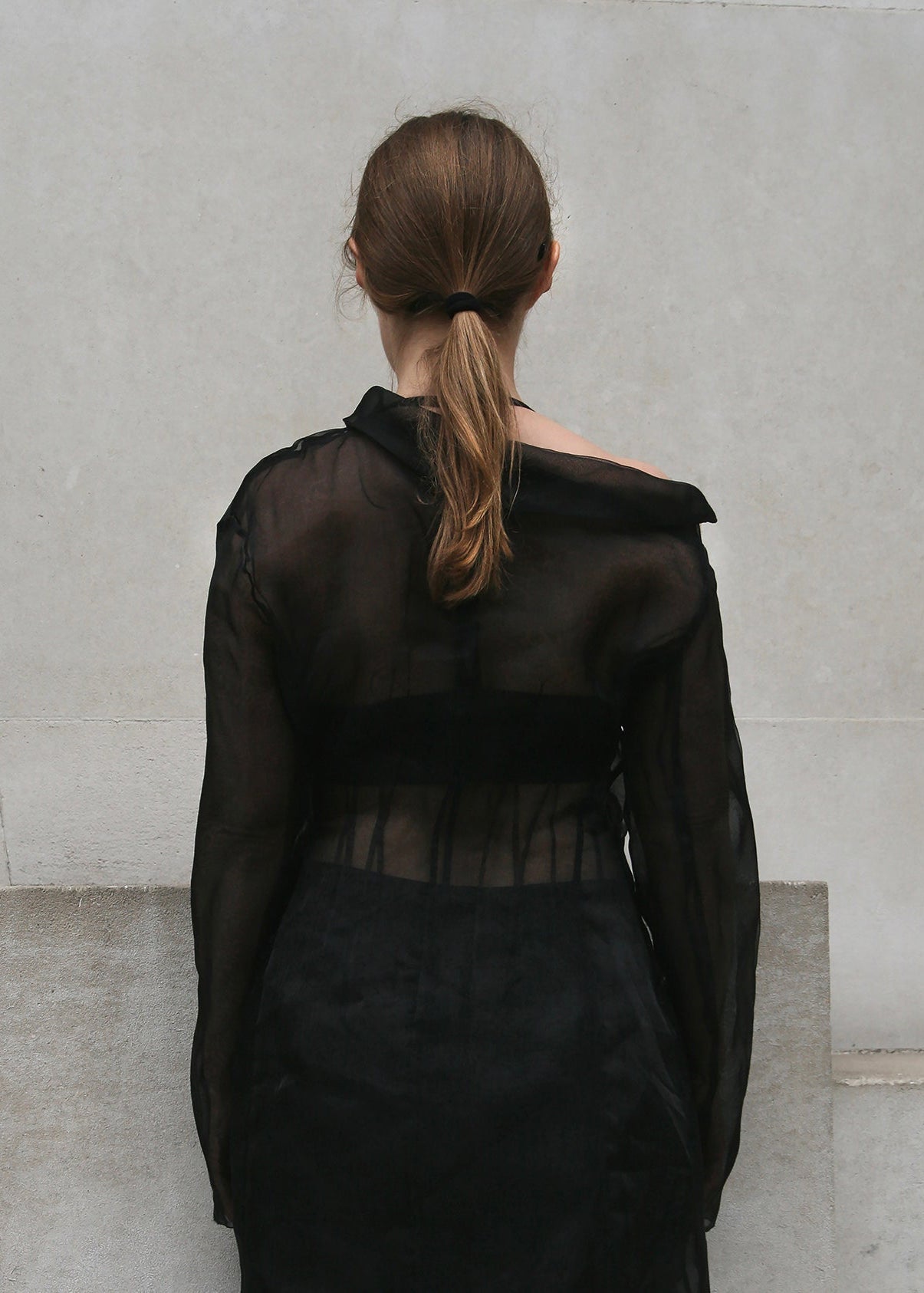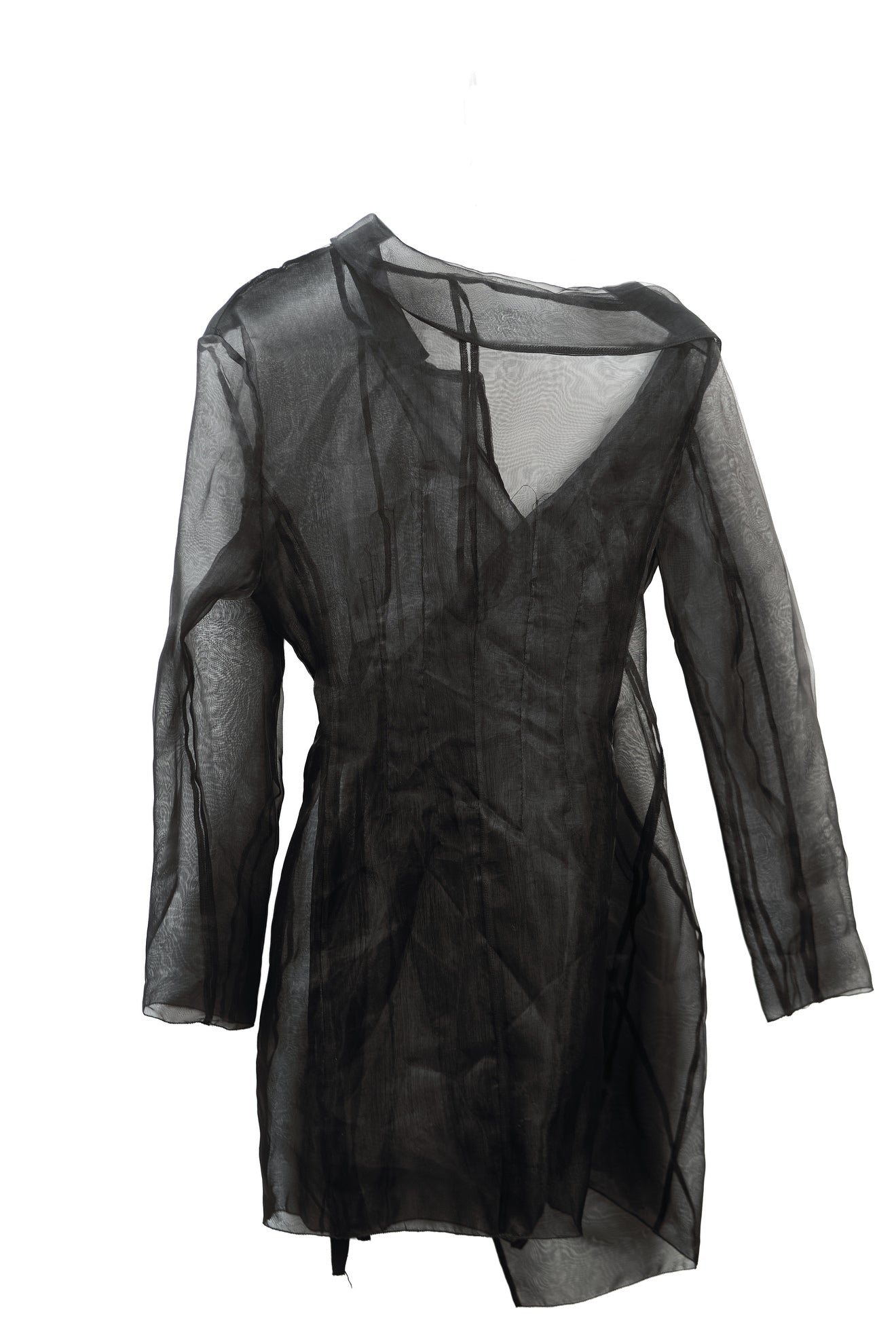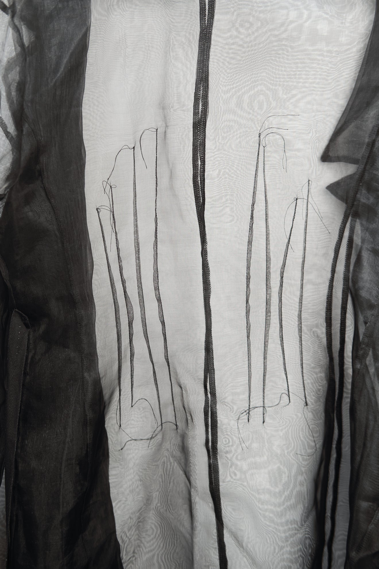 Asymmetrischer Blazer aus doppellagigem schwarzem Organza mit Viskose.