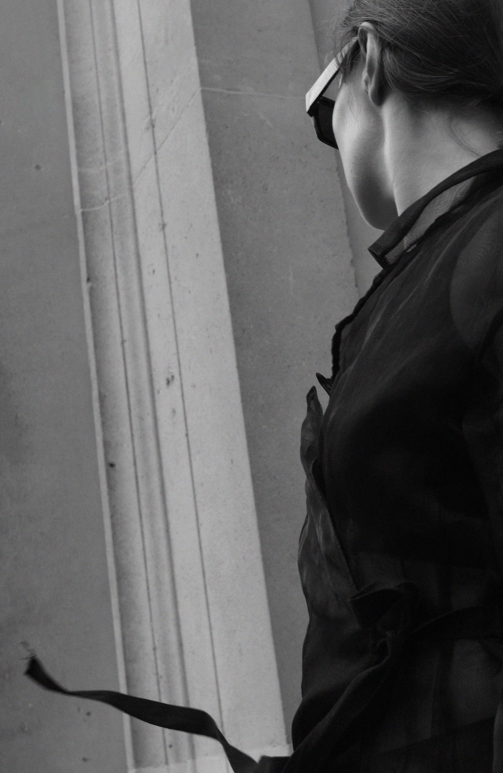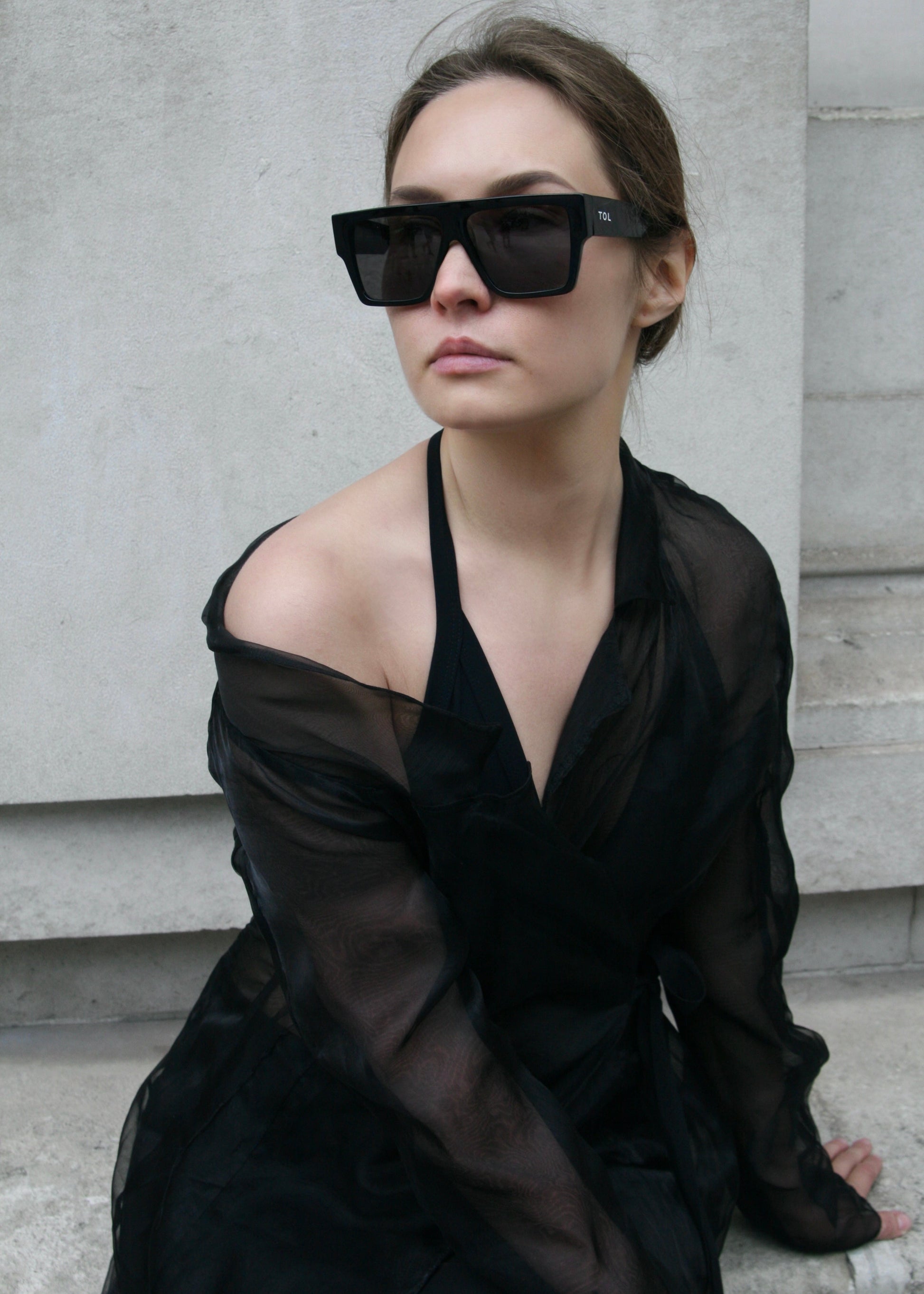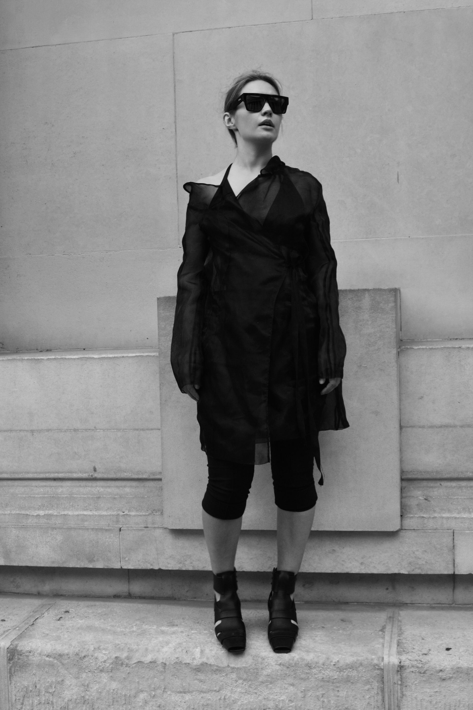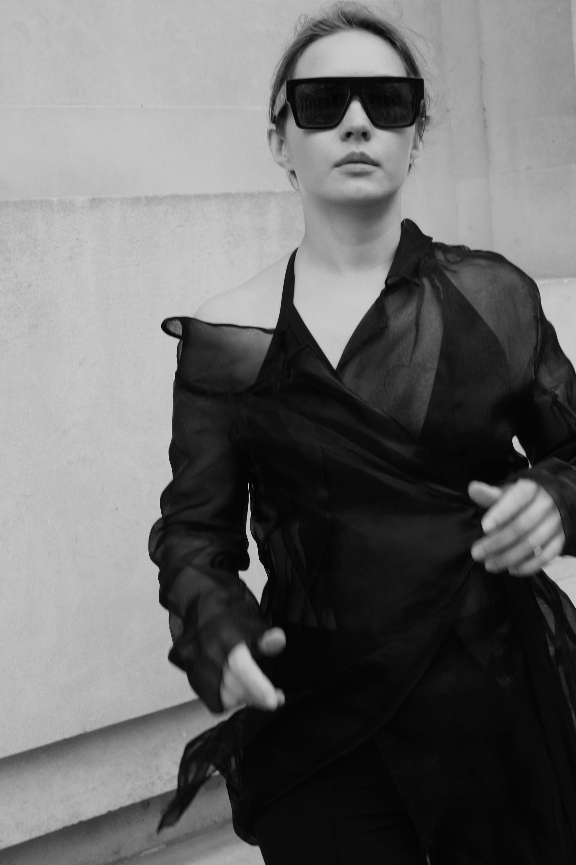 Asymmetrischer Blazer aus doppellagigem schwarzem Organza mit Viskose.