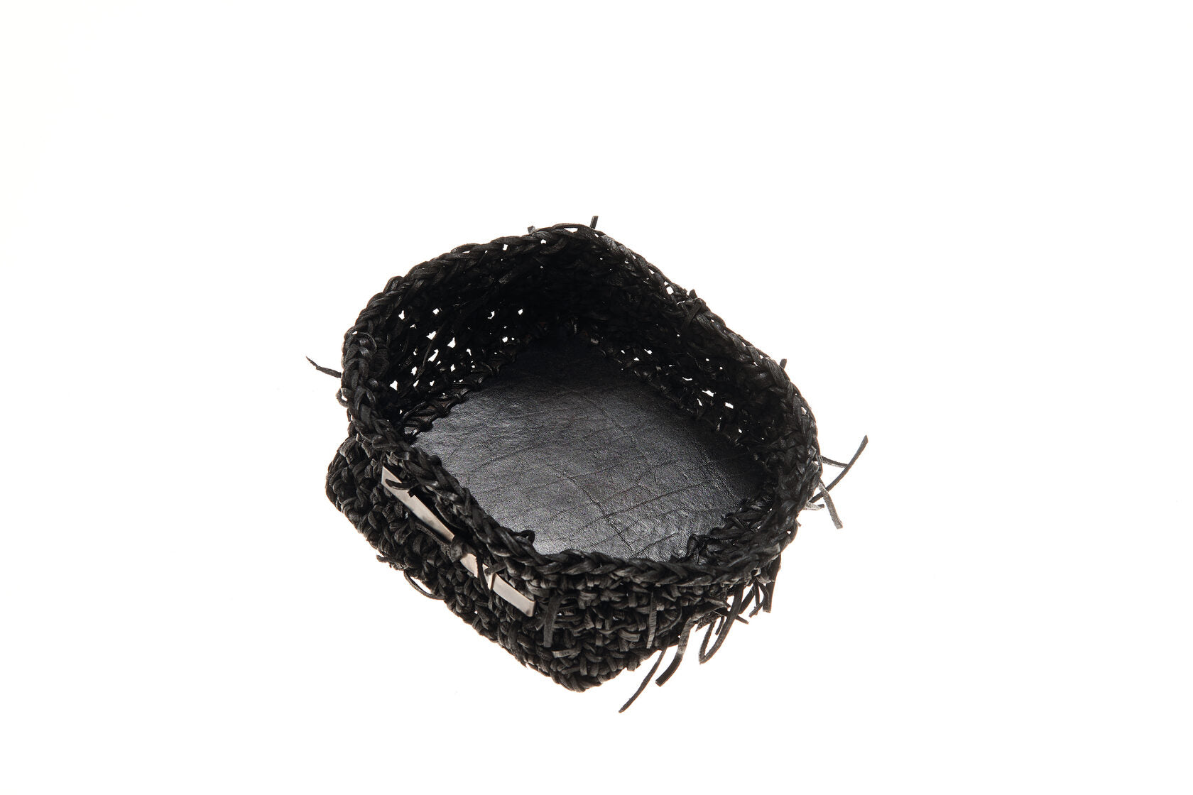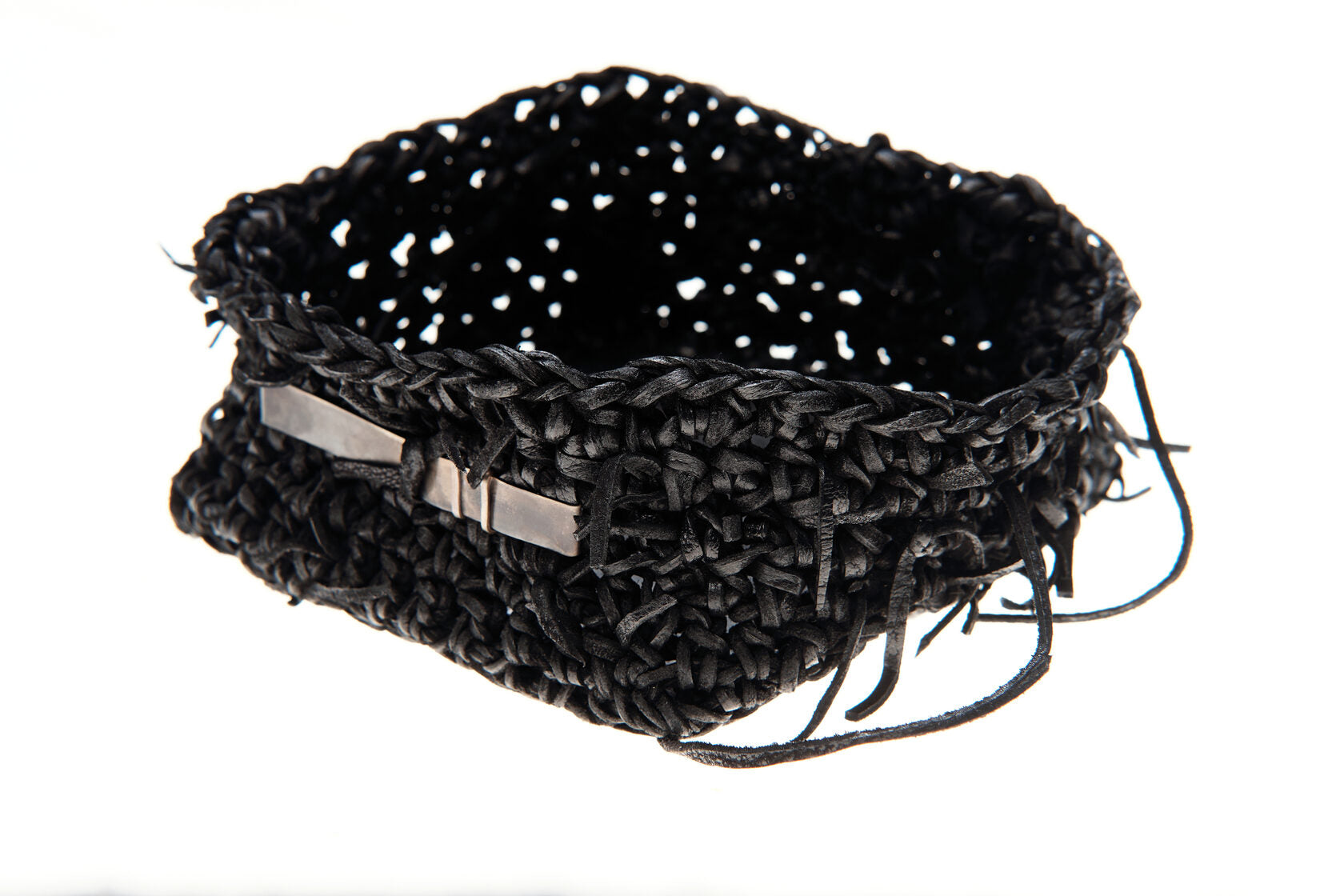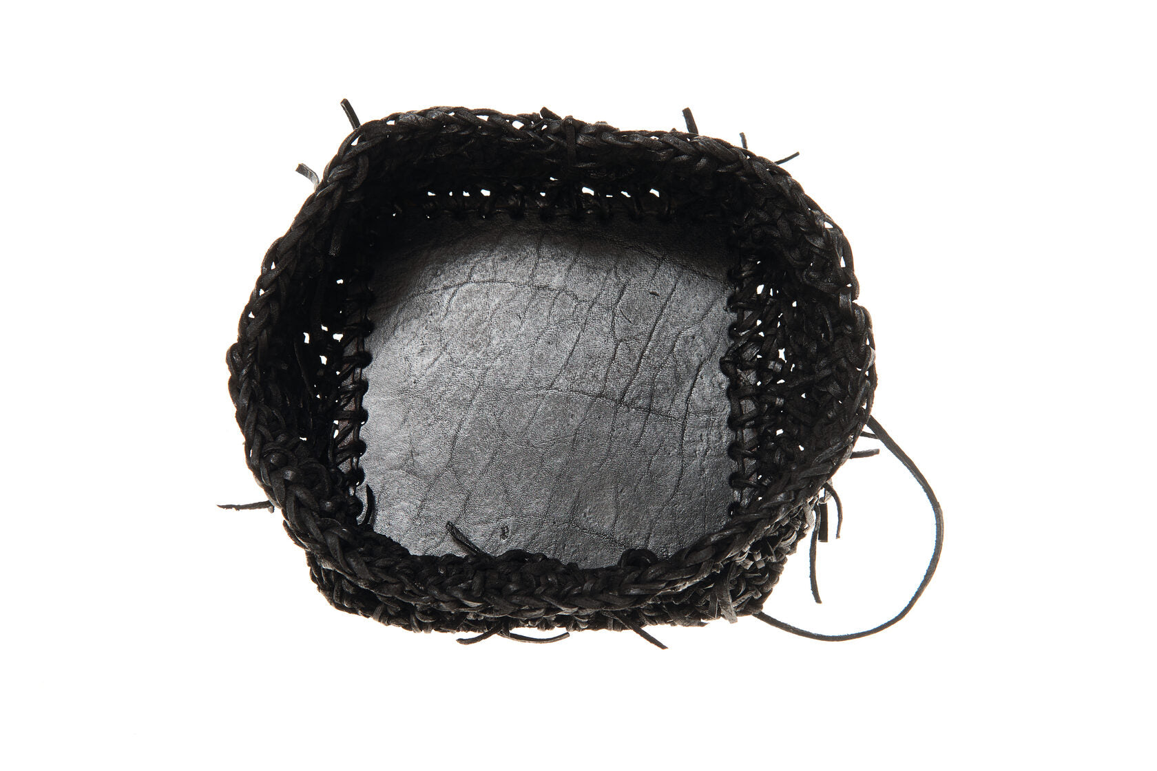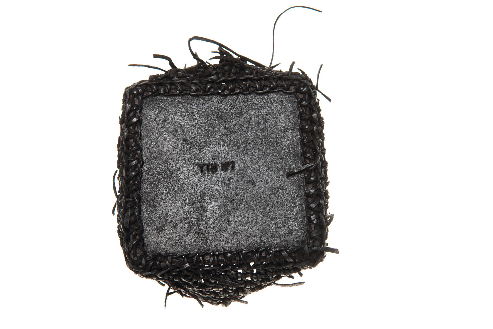 Jede Box wird von meiner Großmutter in Russland aus Lederresten handgeschnitten und handgestrickt. Sie wird in unserem Londoner Studio zusammengesetzt, schwarz gefärbt und wasserabweisend behandelt. Auf einer dicken, strukturierten Lederbasis und mit Neusilber-Akzenten versehen, ist dieses Stück als funktionales Aufbewahrungsobjekt konzipiert.