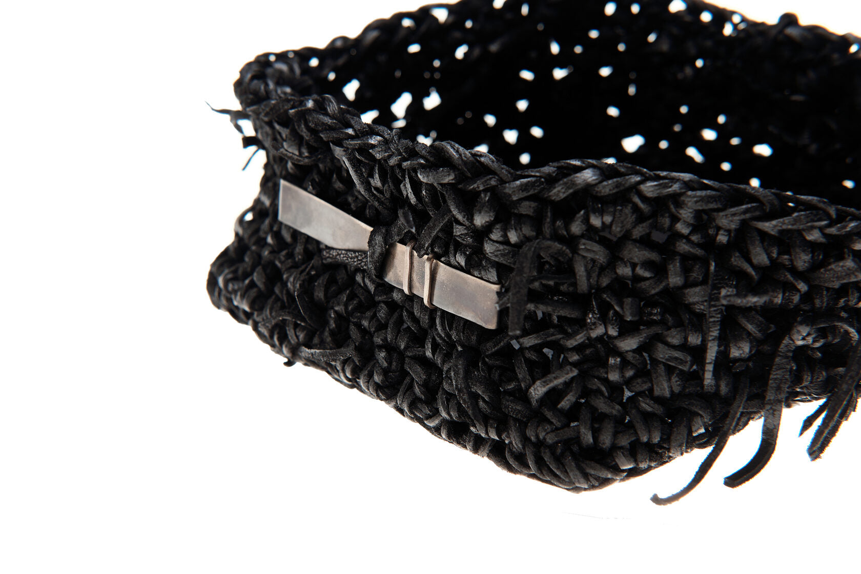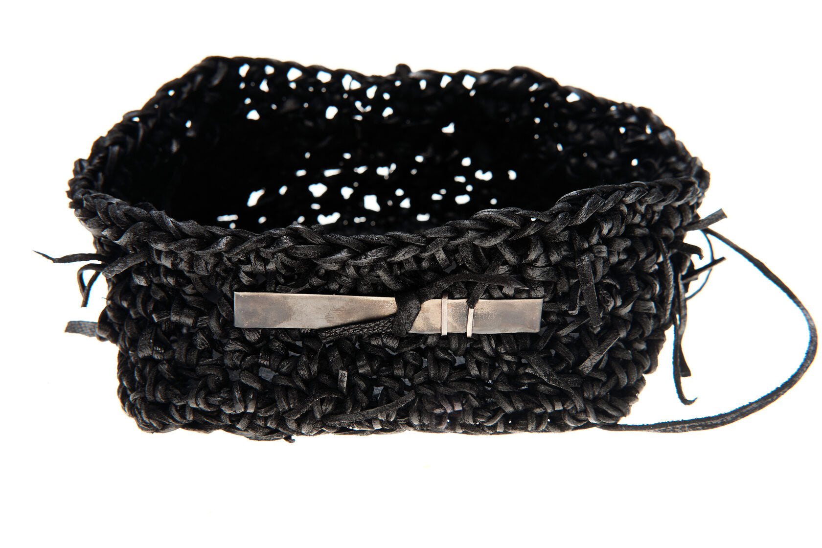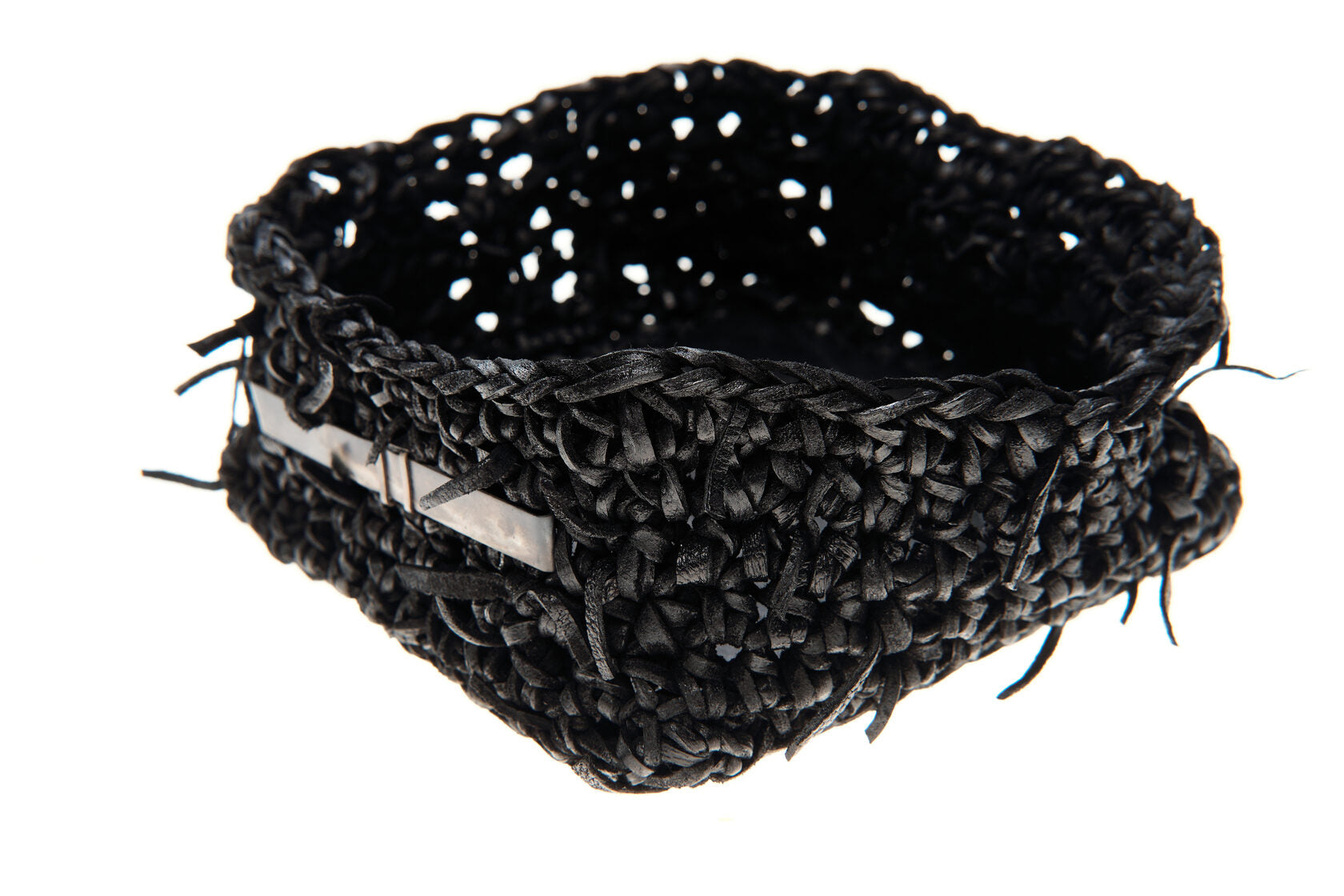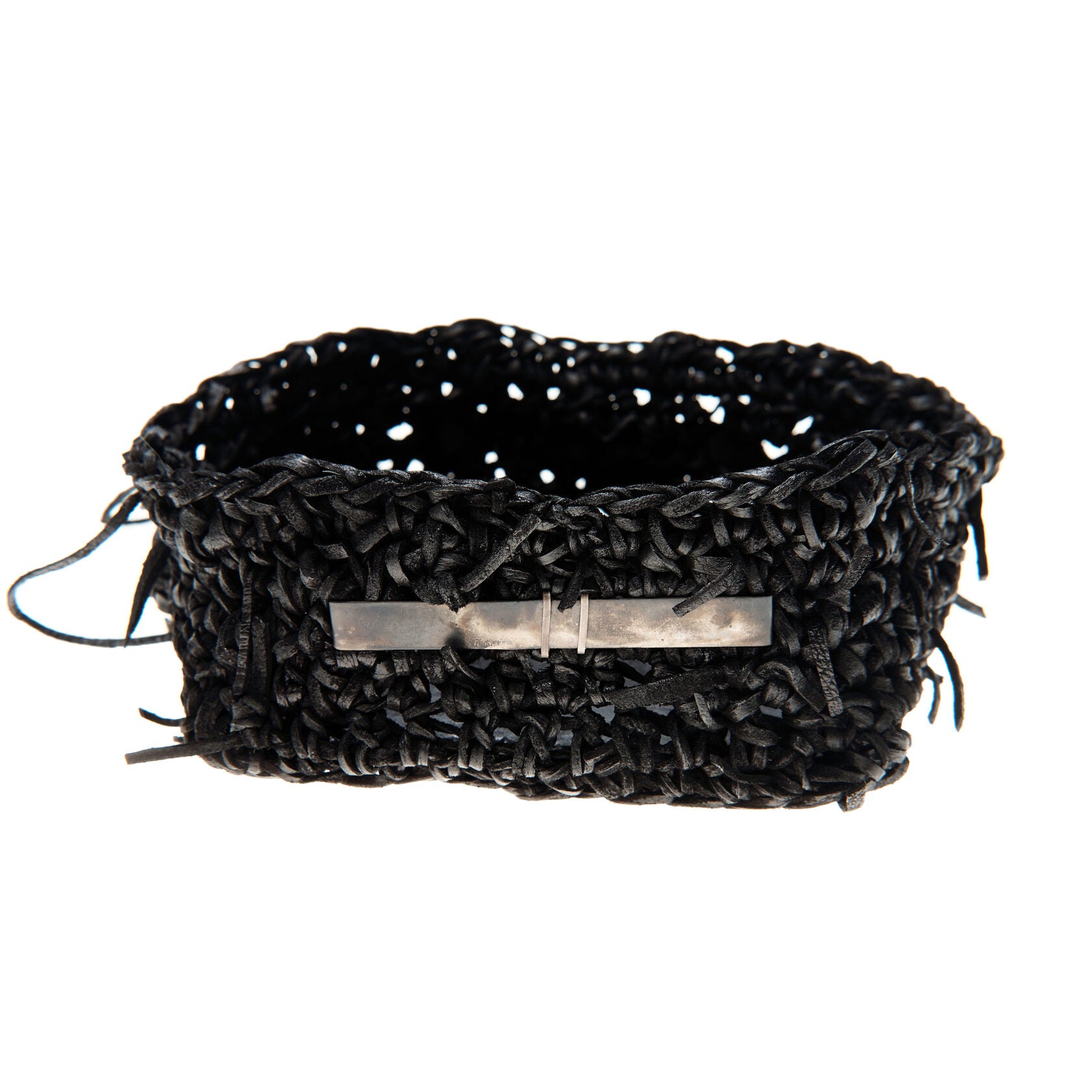 Jede Box wird von meiner Großmutter in Russland aus Lederresten handgeschnitten und handgestrickt. Sie wird in unserem Londoner Studio zusammengesetzt, schwarz gefärbt und wasserabweisend behandelt. Auf einer dicken, strukturierten Lederbasis und mit Neusilber-Akzenten versehen, ist dieses Stück als funktionales Aufbewahrungsobjekt konzipiert.