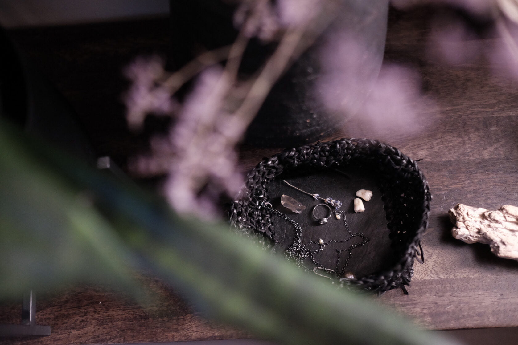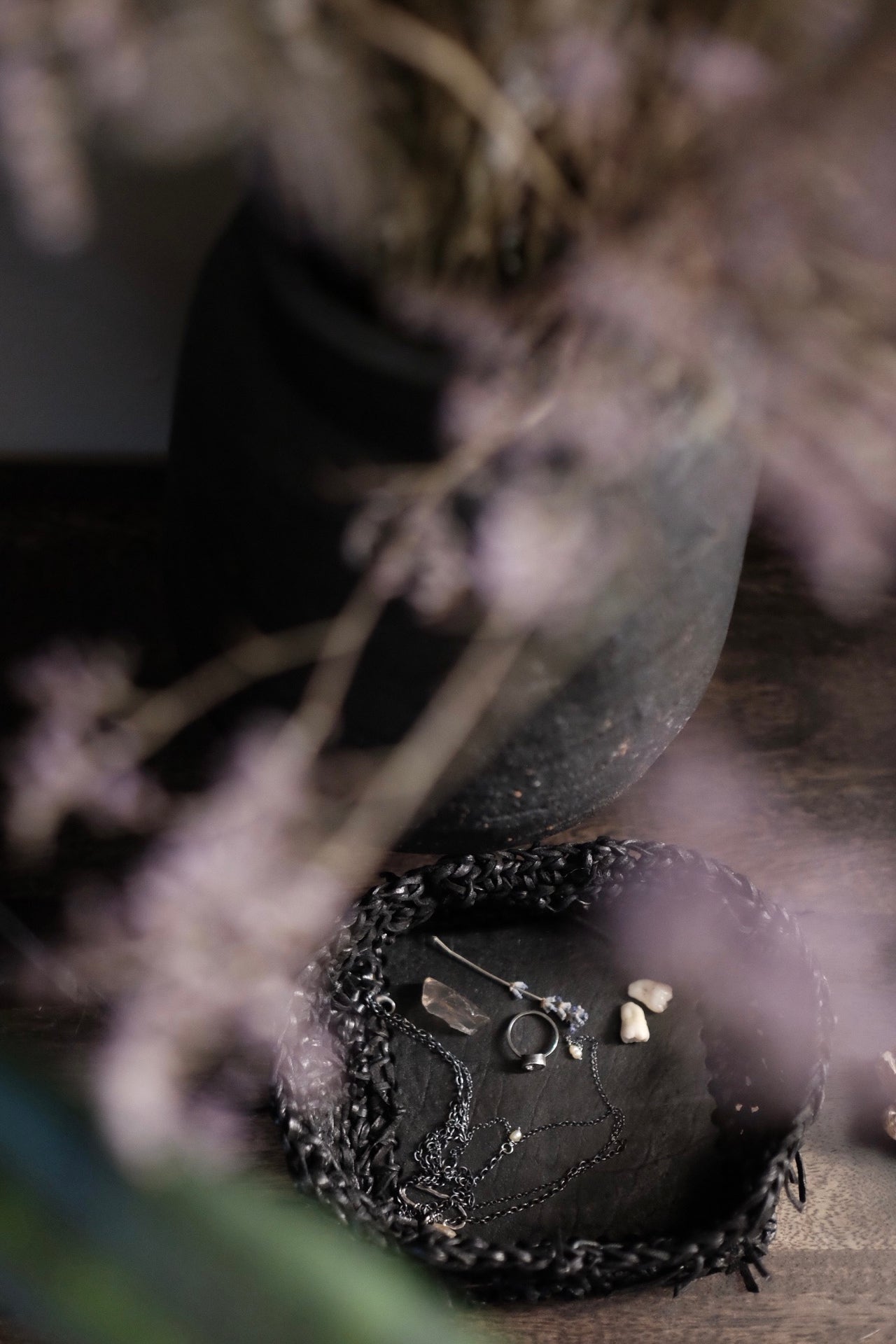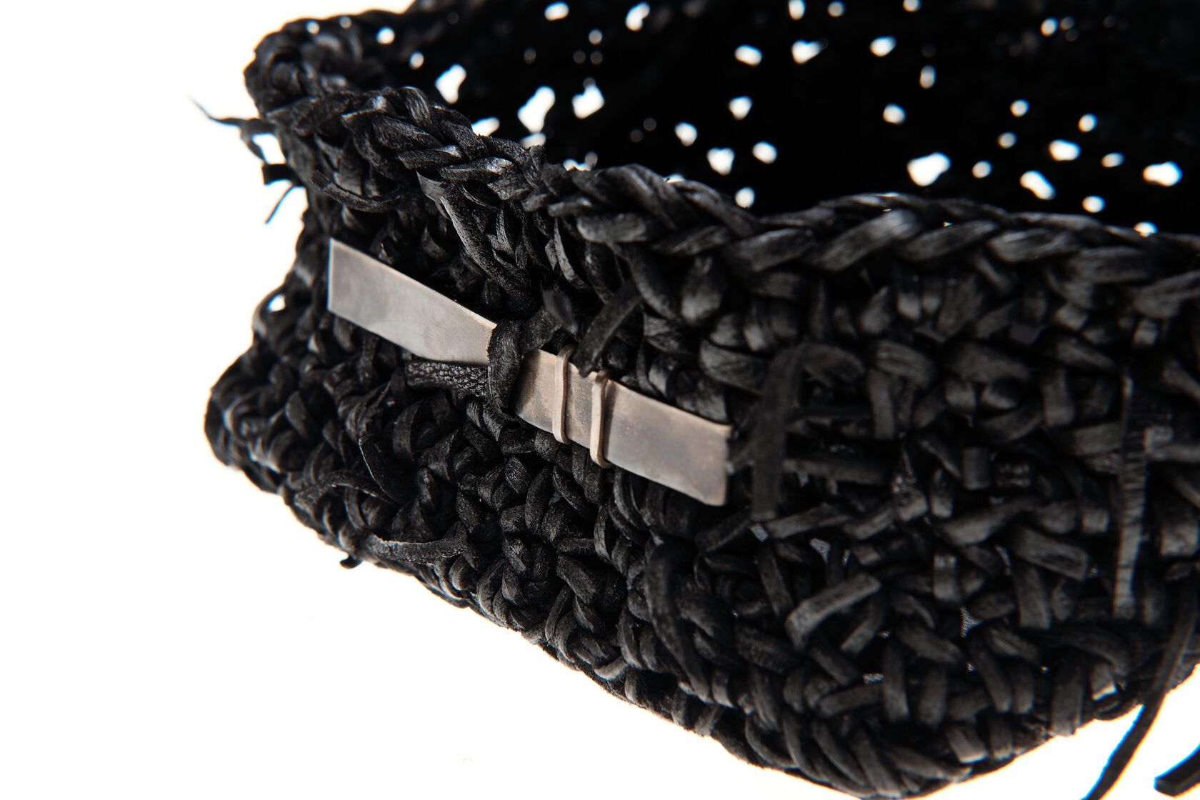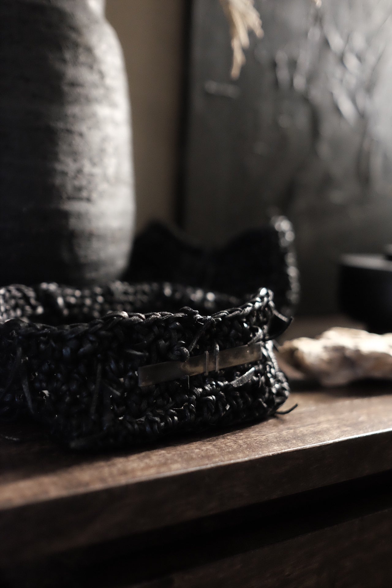 Jede Box wird von meiner Großmutter in Russland aus Lederresten handgeschnitten und handgestrickt. Sie wird in unserem Londoner Studio zusammengesetzt, schwarz gefärbt und wasserabweisend behandelt. Auf einer dicken, strukturierten Lederbasis und mit Neusilber-Akzenten versehen, ist dieses Stück als funktionales Aufbewahrungsobjekt konzipiert.