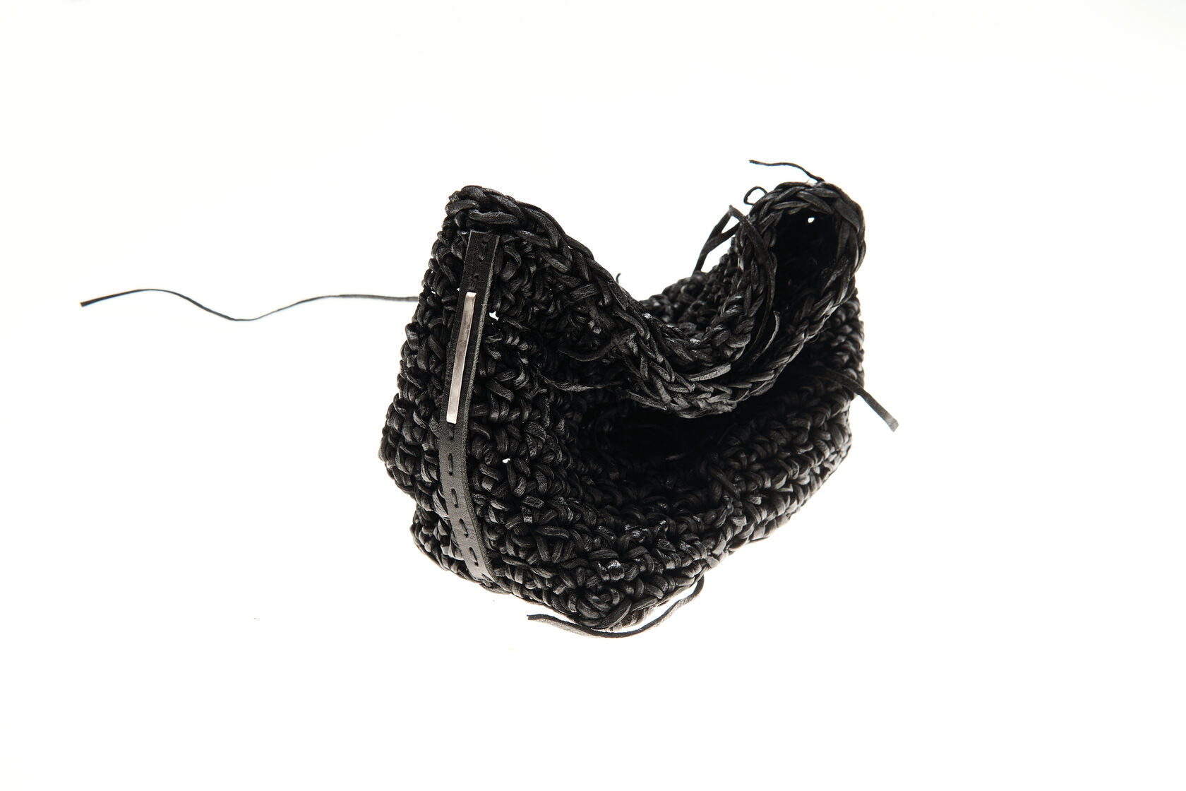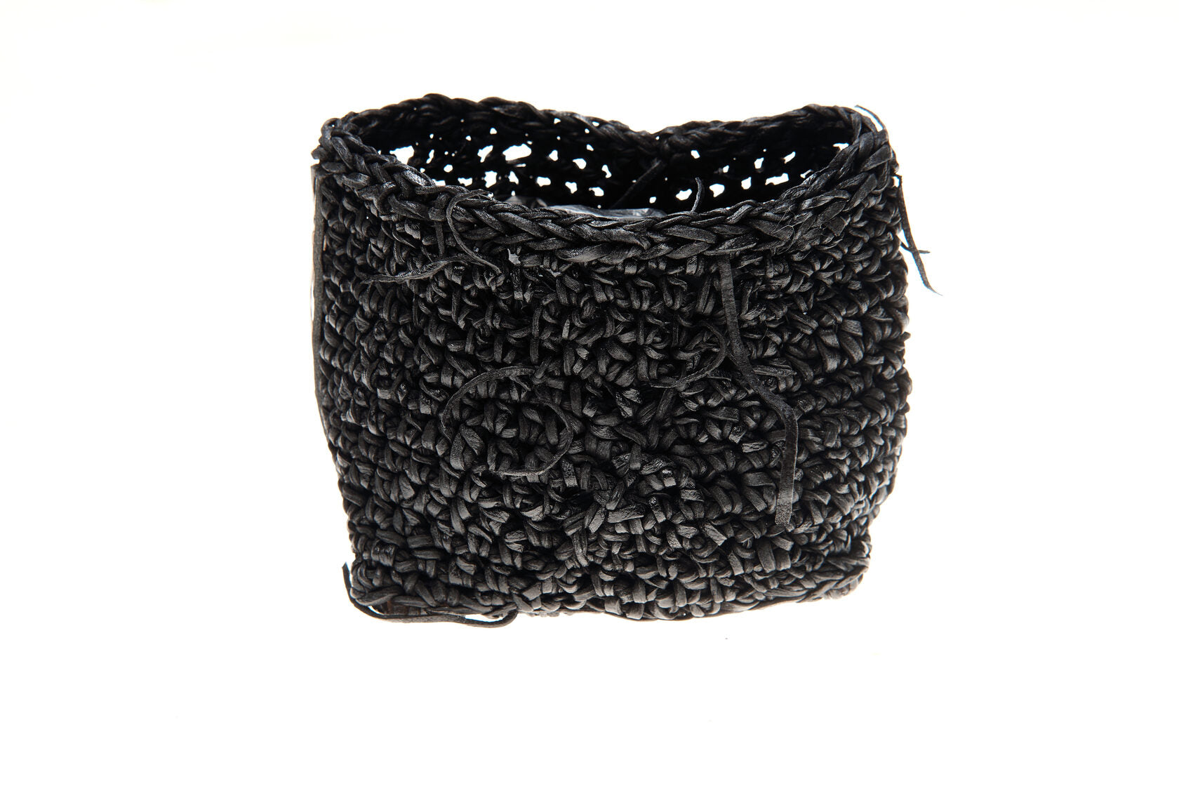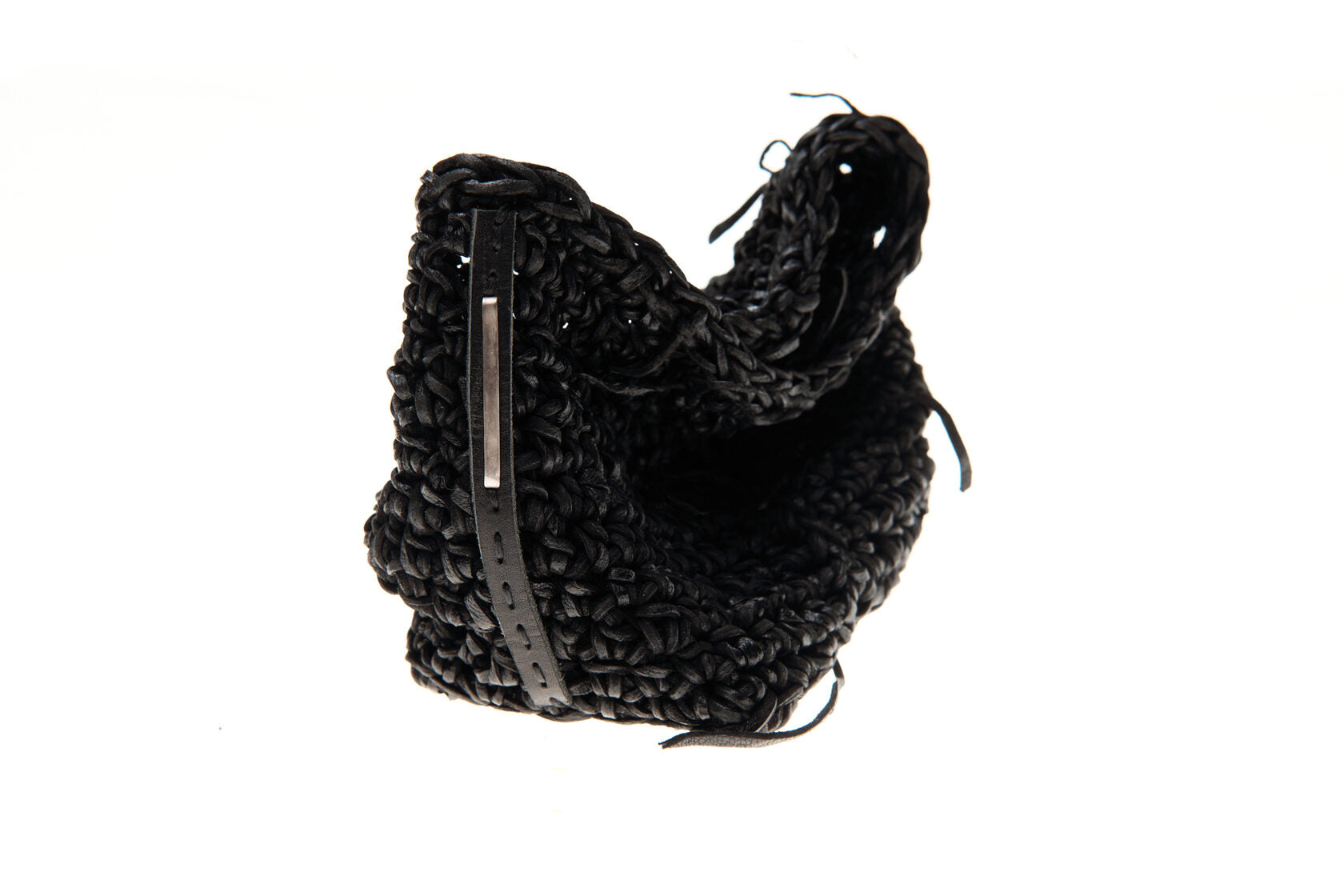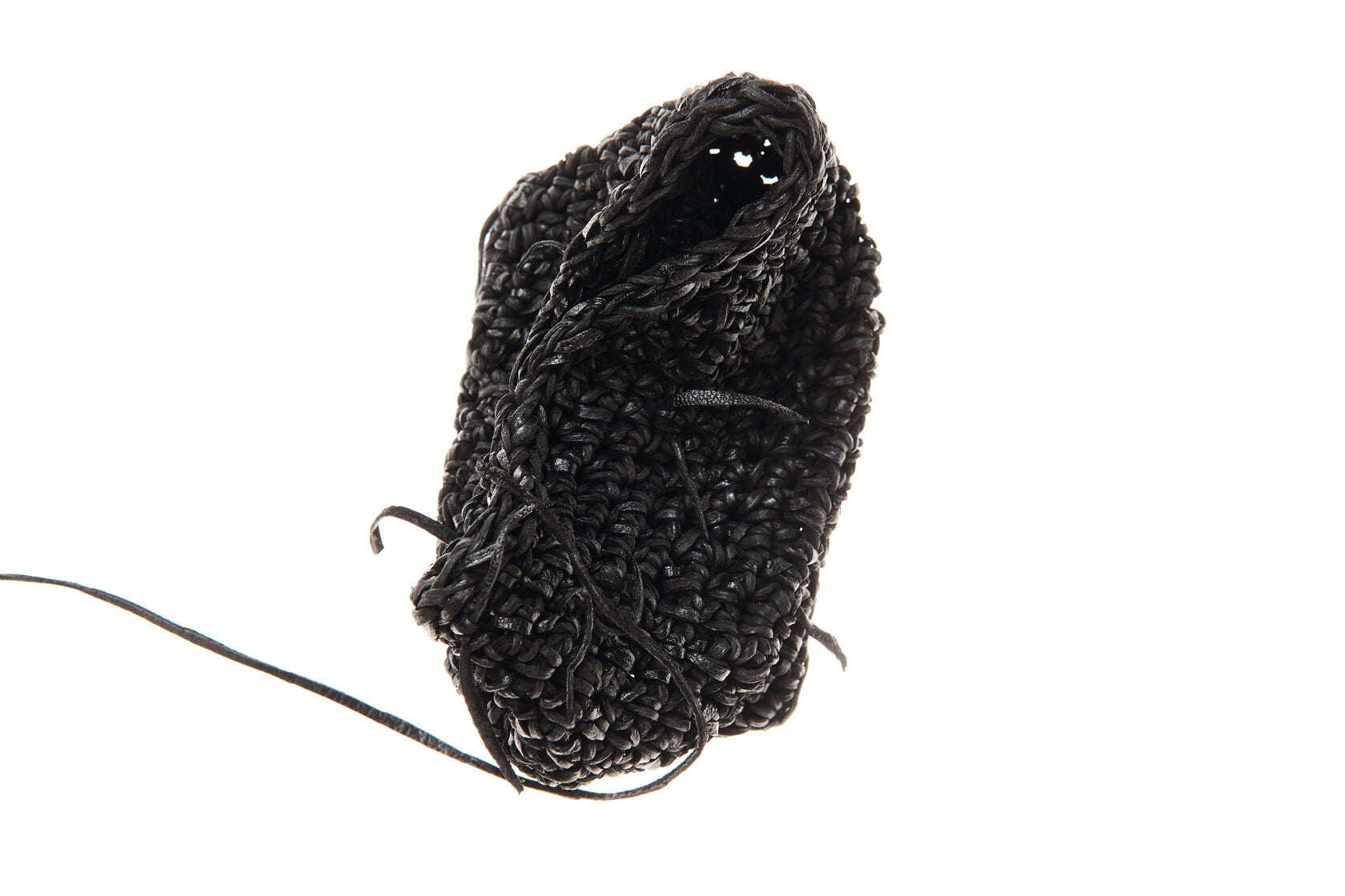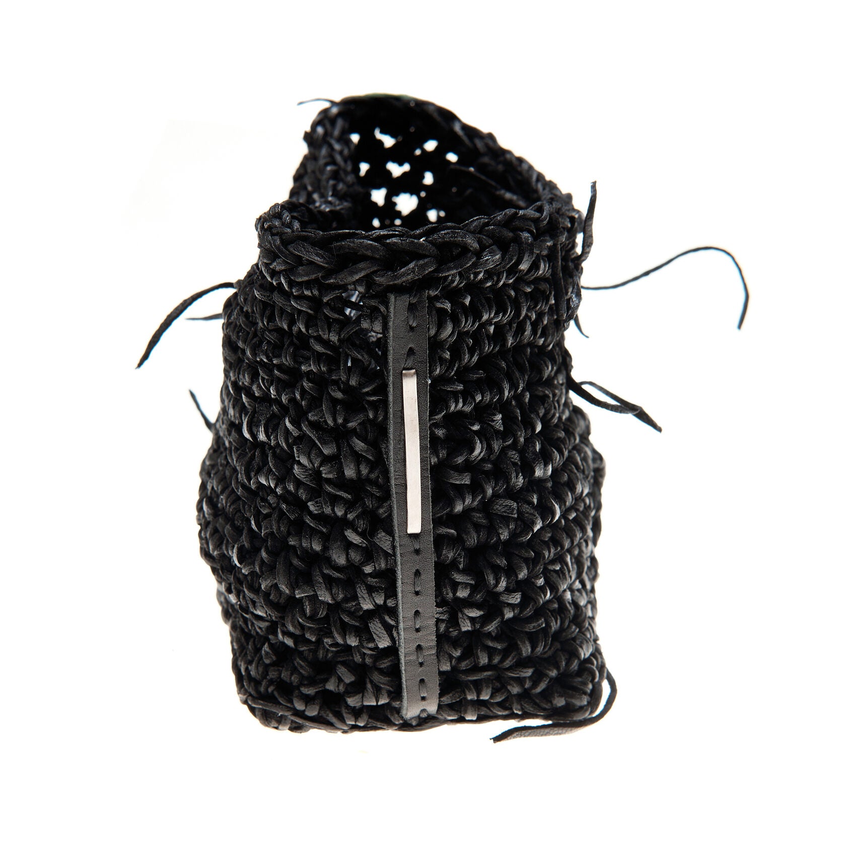 Jede Box wird von meiner Großmutter in Russland aus Lederresten handgeschnitten und handgestrickt. Sie wird in unserem Londoner Studio zusammengesetzt, schwarz gefärbt und wasserabweisend behandelt. Auf einer dicken, strukturierten Lederbasis und mit Neusilber-Akzenten versehen, ist dieses Stück als funktionales Aufbewahrungsobjekt konzipiert.