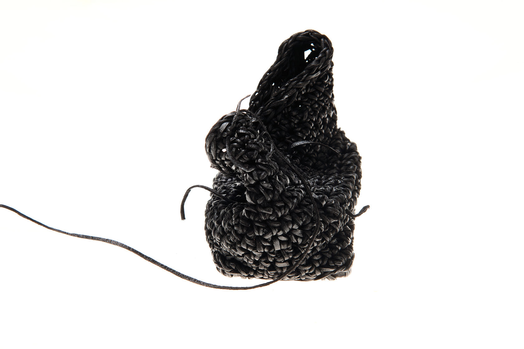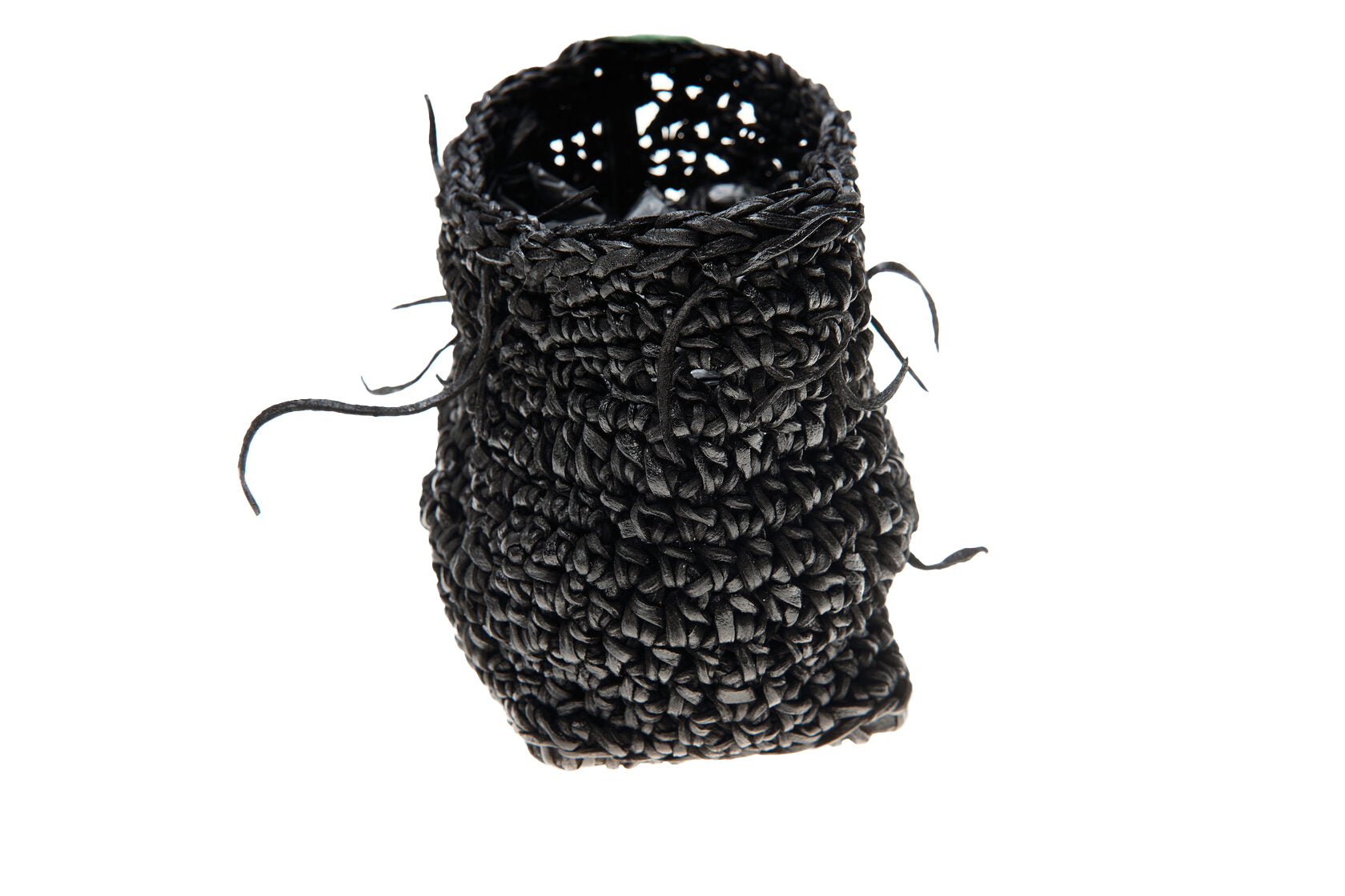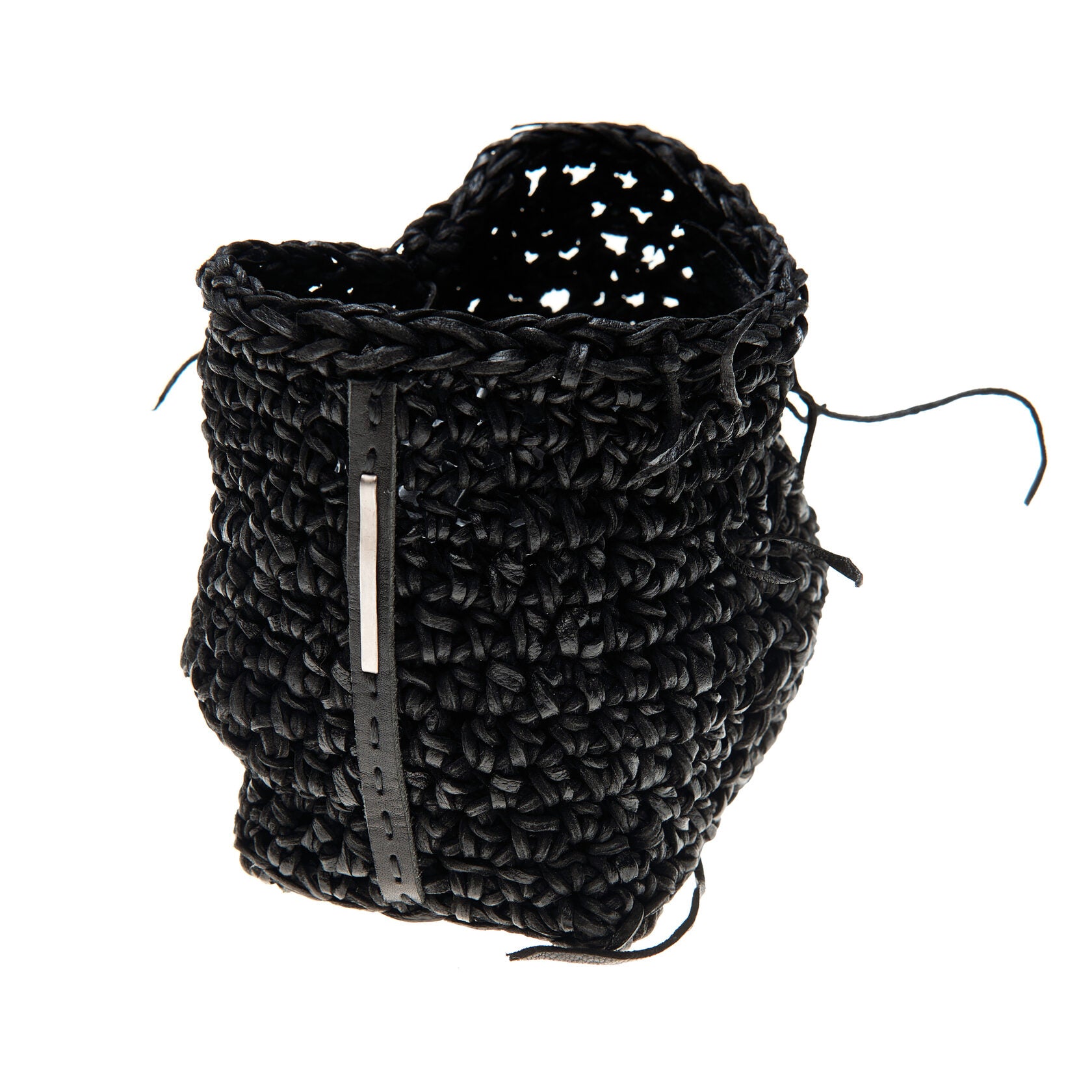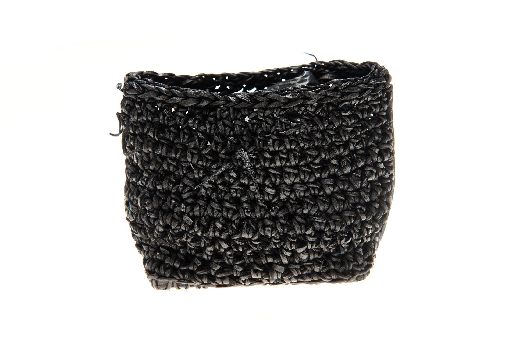 Jede Box wird von meiner Großmutter in Russland aus Lederresten handgeschnitten und handgestrickt. Sie wird in unserem Londoner Studio zusammengesetzt, schwarz gefärbt und wasserabweisend behandelt. Auf einer dicken, strukturierten Lederbasis und mit Neusilber-Akzenten versehen, ist dieses Stück als funktionales Aufbewahrungsobjekt konzipiert.