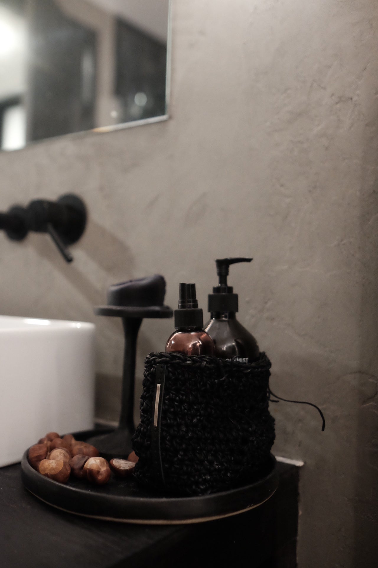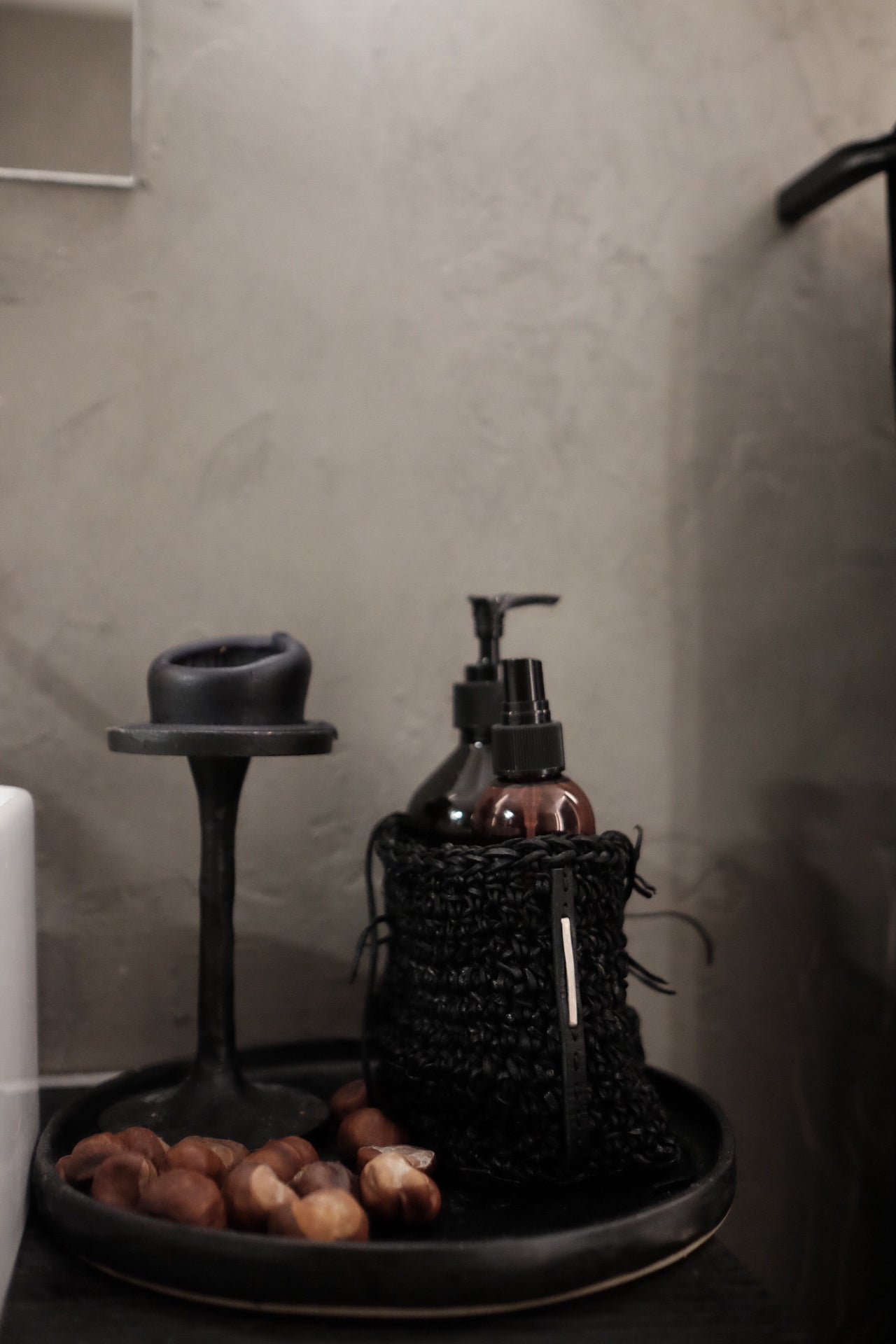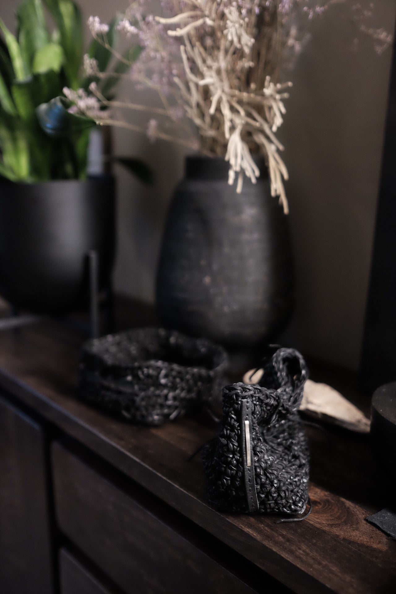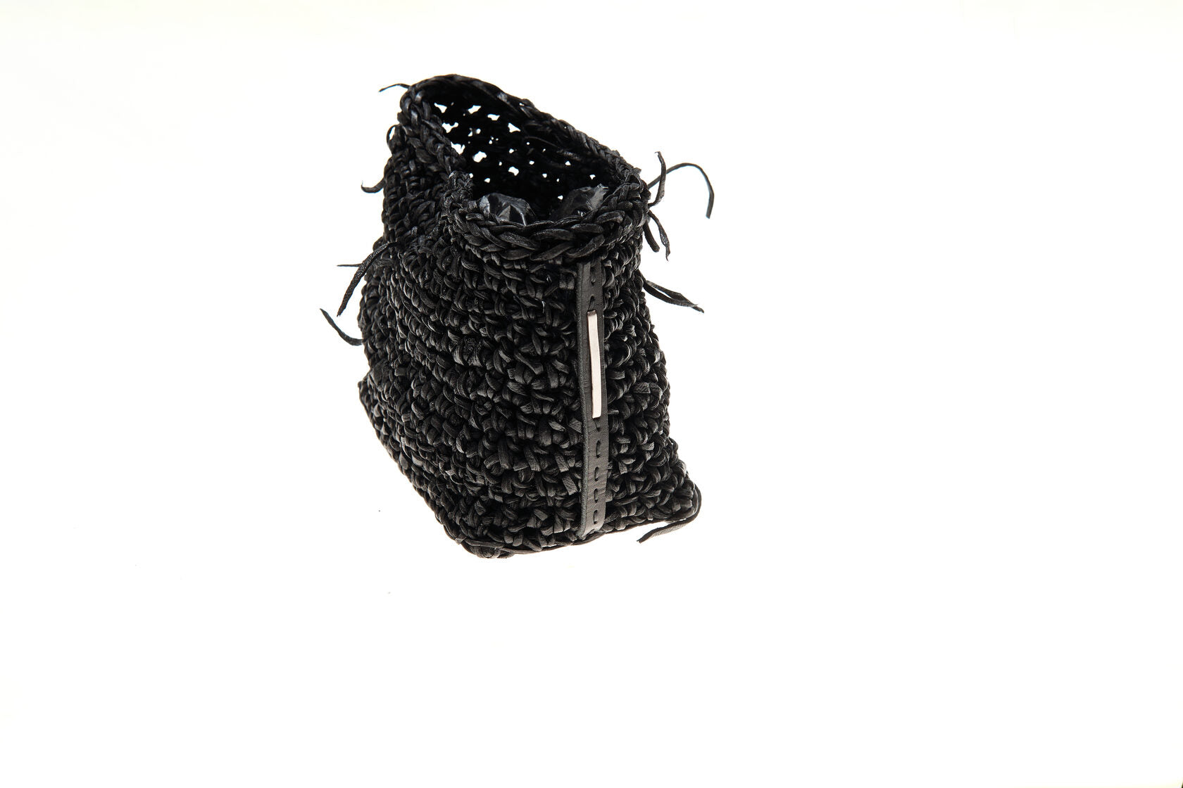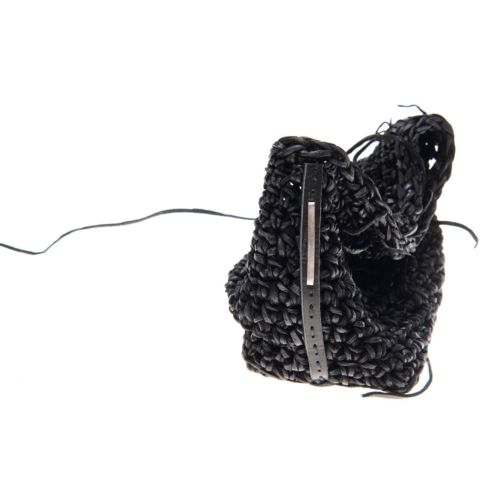 Jede Box wird von meiner Großmutter in Russland aus Lederresten handgeschnitten und handgestrickt. Sie wird in unserem Londoner Studio zusammengesetzt, schwarz gefärbt und wasserabweisend behandelt. Auf einer dicken, strukturierten Lederbasis und mit Neusilber-Akzenten versehen, ist dieses Stück als funktionales Aufbewahrungsobjekt konzipiert.