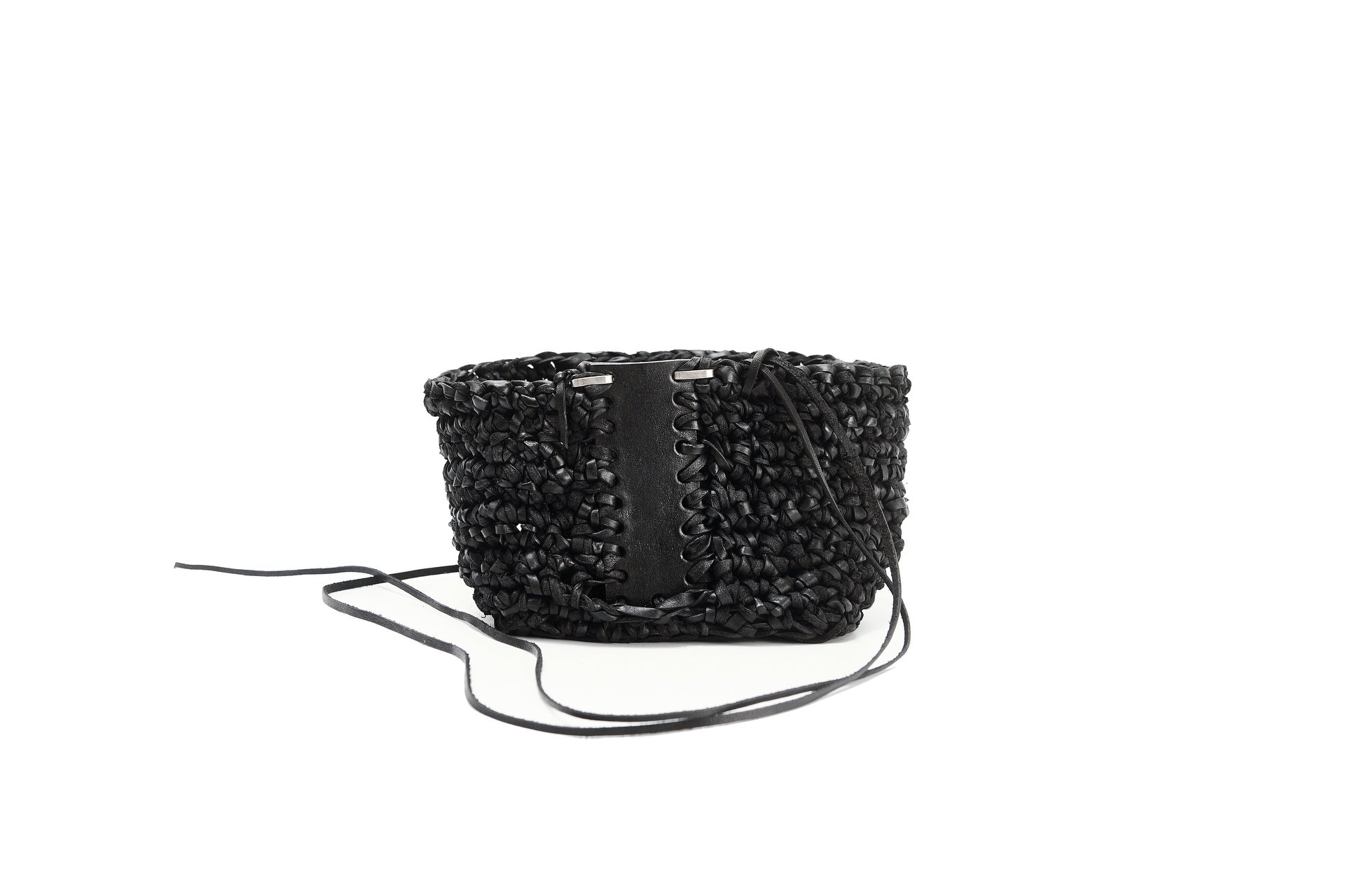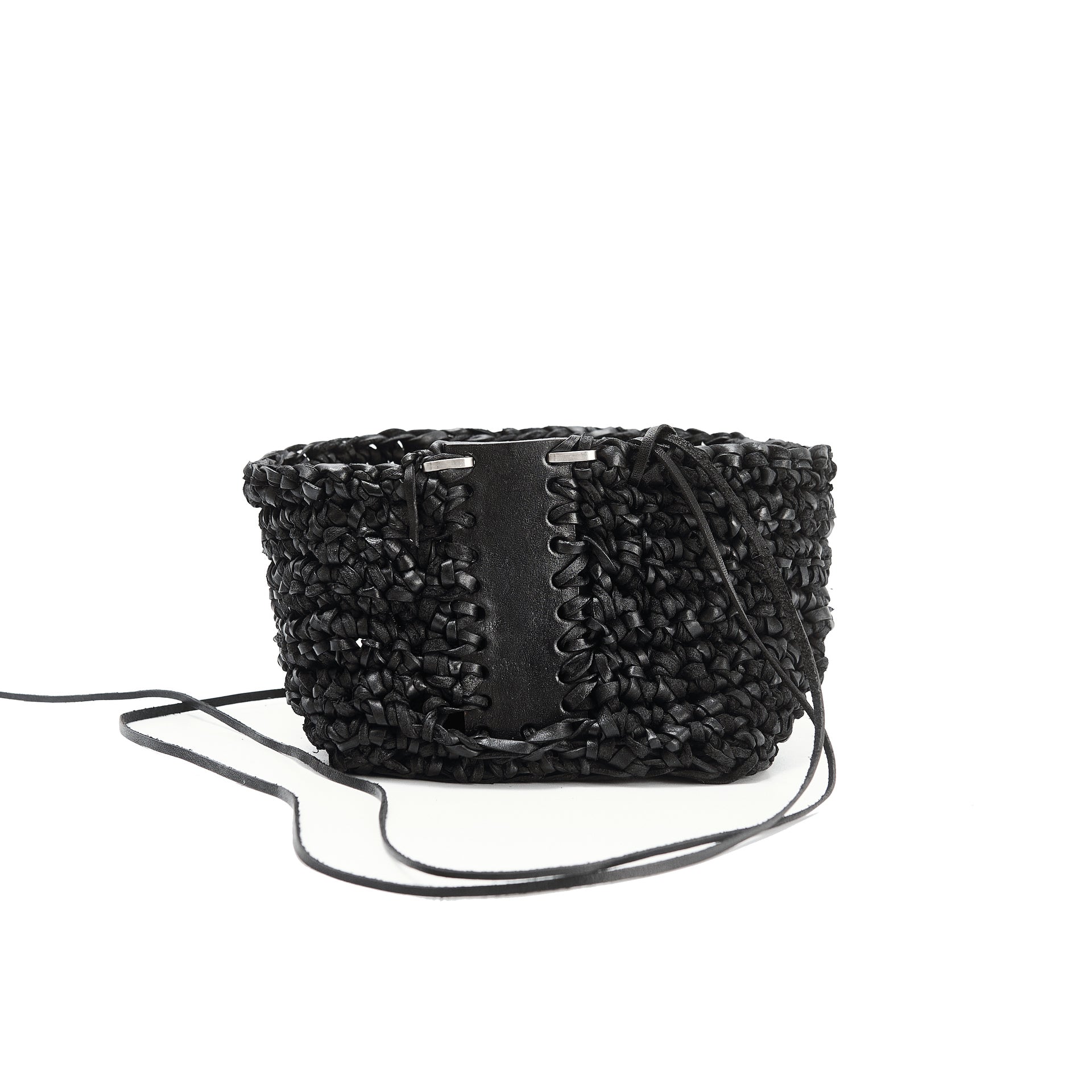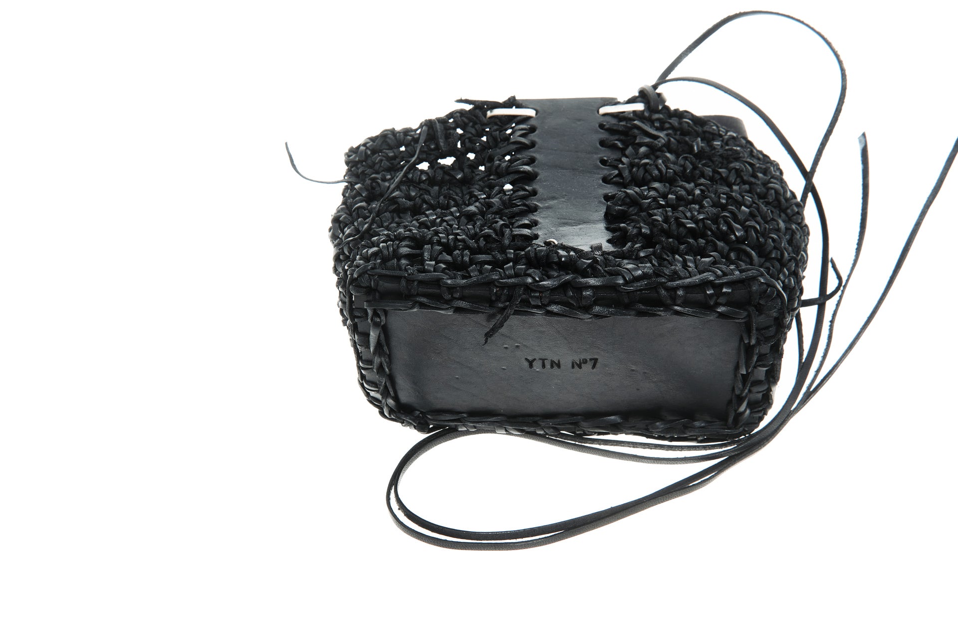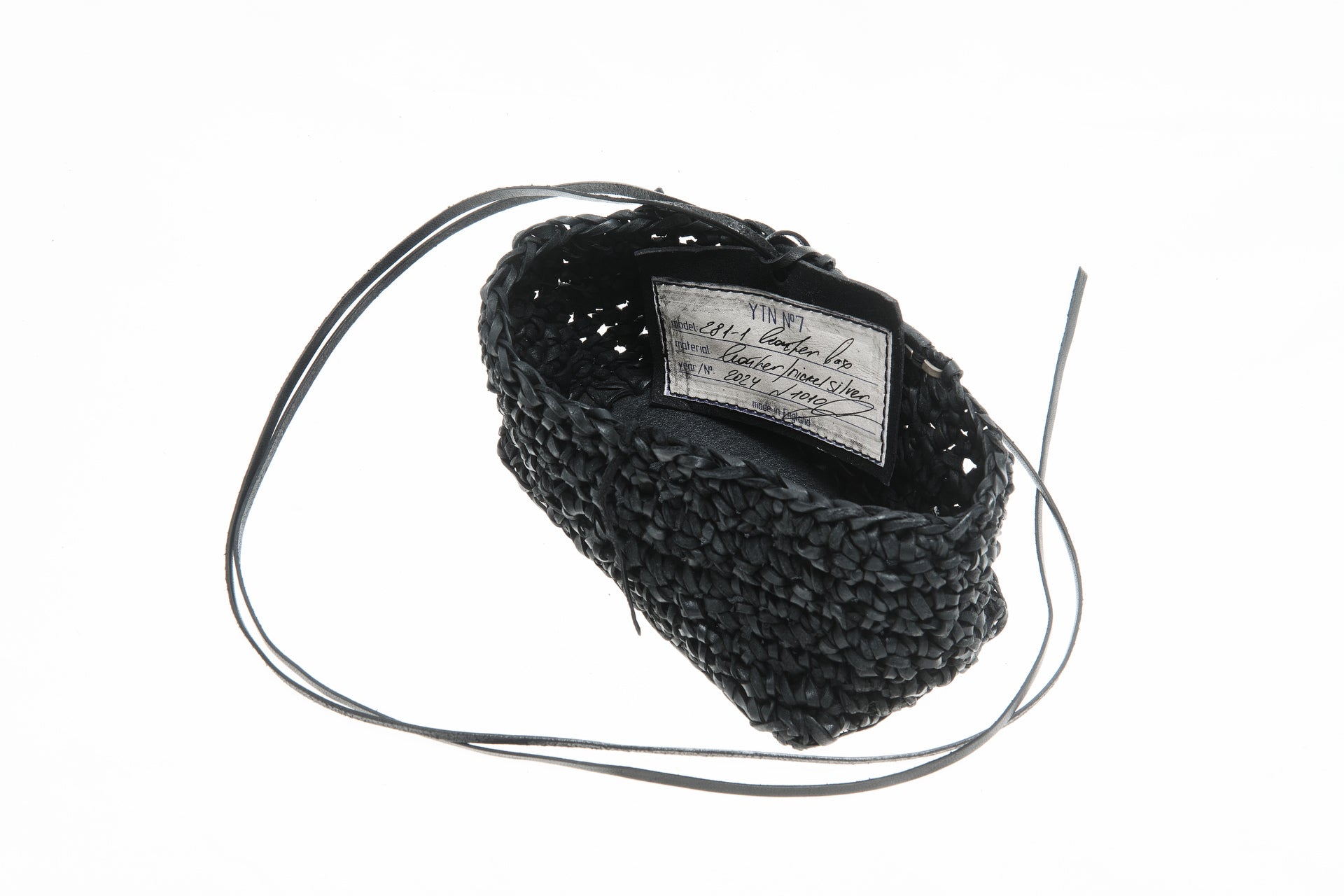 Jede Box wird von meiner Großmutter in Russland aus Lederresten handgeschnitten und handgestrickt. Sie wird in unserem Londoner Studio zusammengesetzt, schwarz gefärbt und wasserabweisend behandelt. Auf einer dicken, strukturierten Lederbasis und mit Neusilber-Akzenten versehen, ist dieses Stück als funktionales Aufbewahrungsobjekt konzipiert.