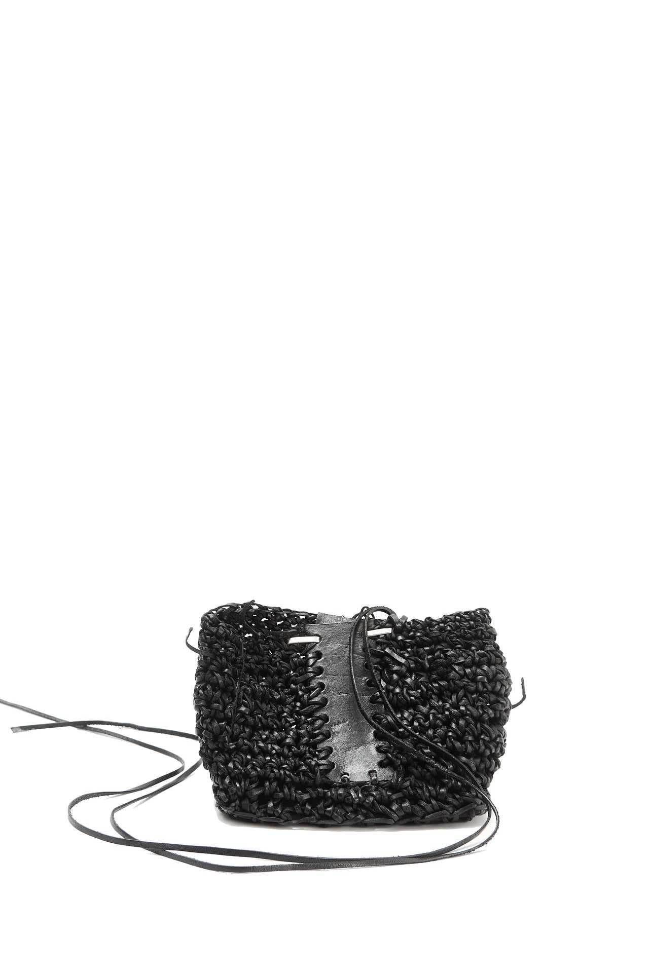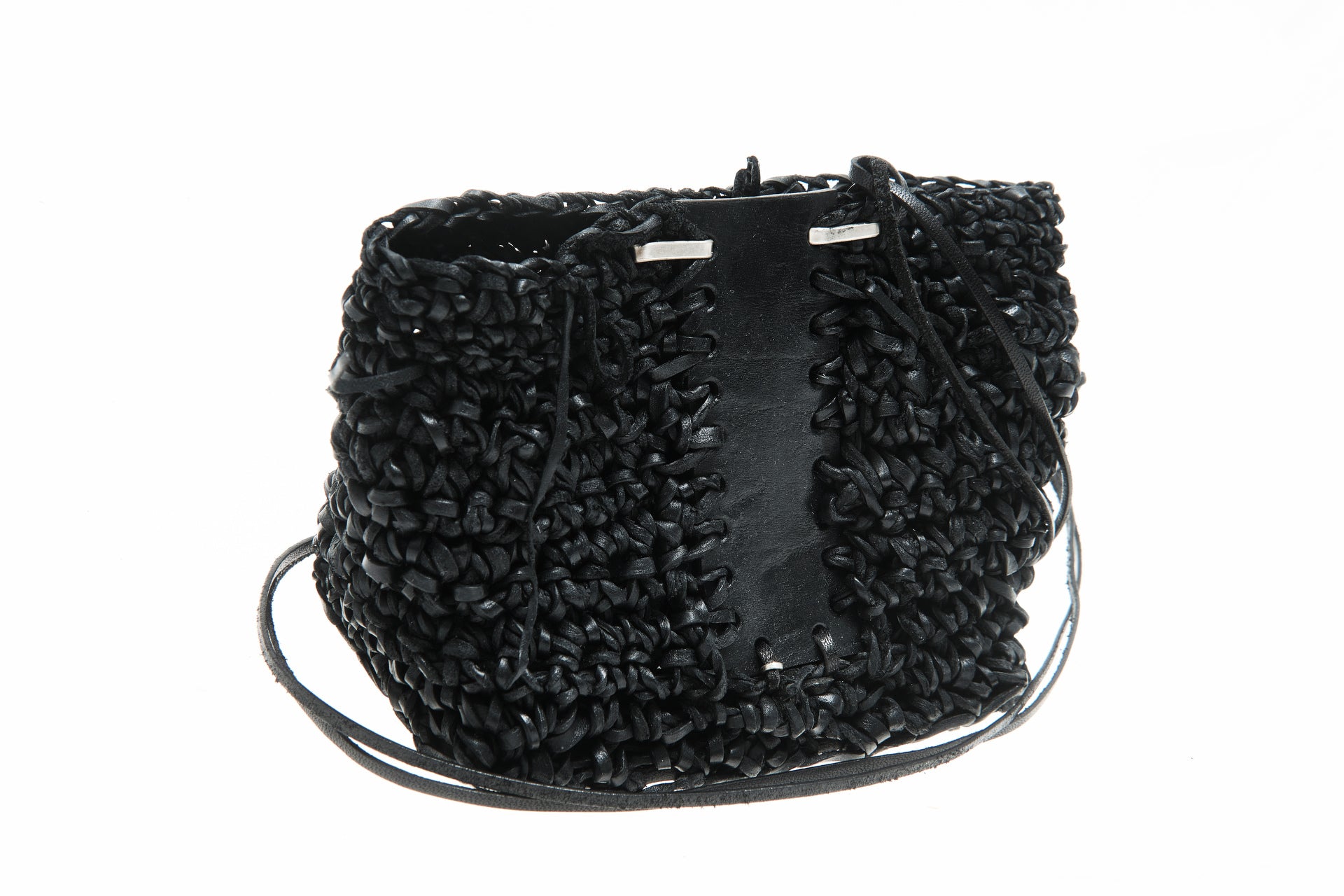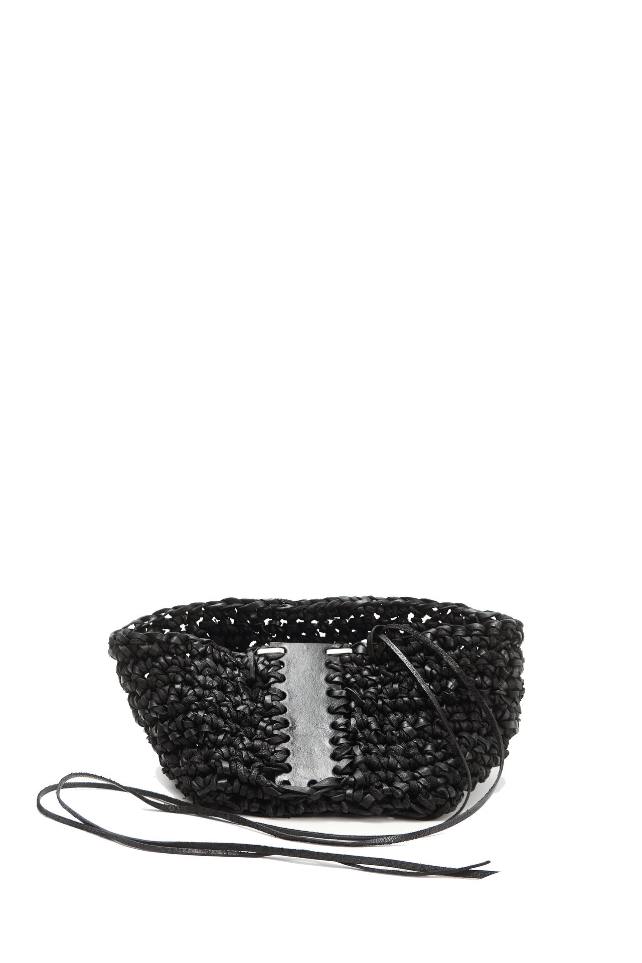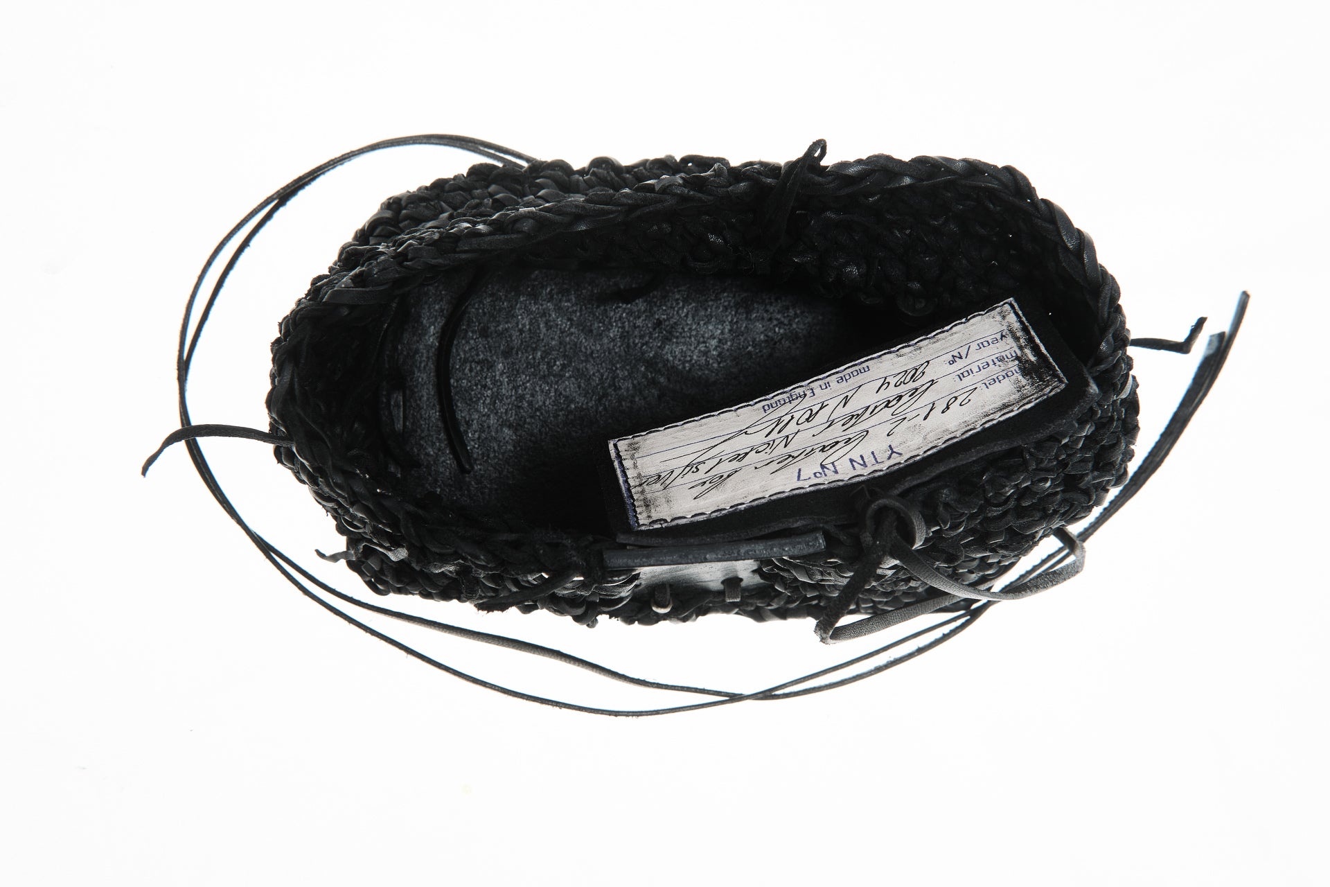 Jede Box wird von meiner Großmutter in Russland aus Lederresten handgeschnitten und handgestrickt. Sie wird in unserem Londoner Studio zusammengesetzt, schwarz gefärbt und wasserabweisend behandelt. Auf einer dicken, strukturierten Lederbasis und mit Neusilber-Akzenten versehen, ist dieses Stück als funktionales Aufbewahrungsobjekt konzipiert.