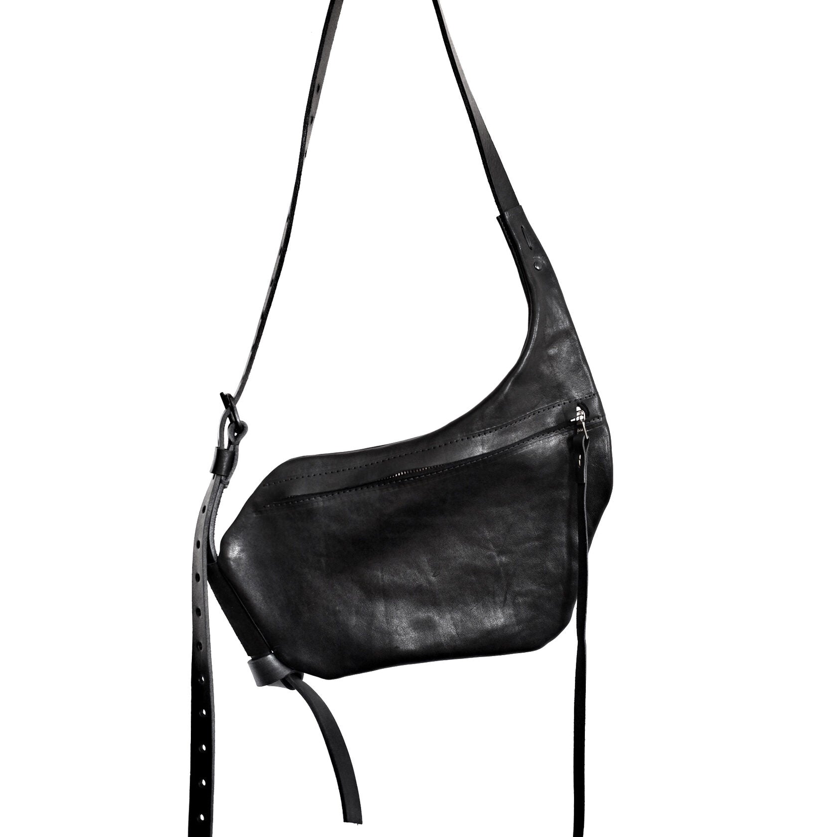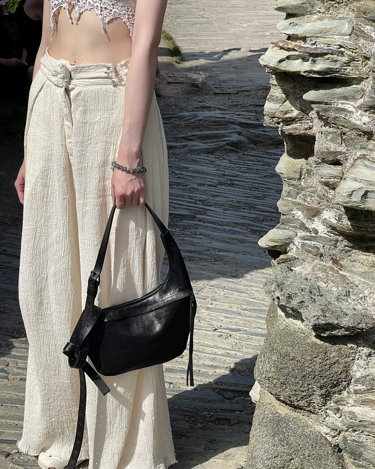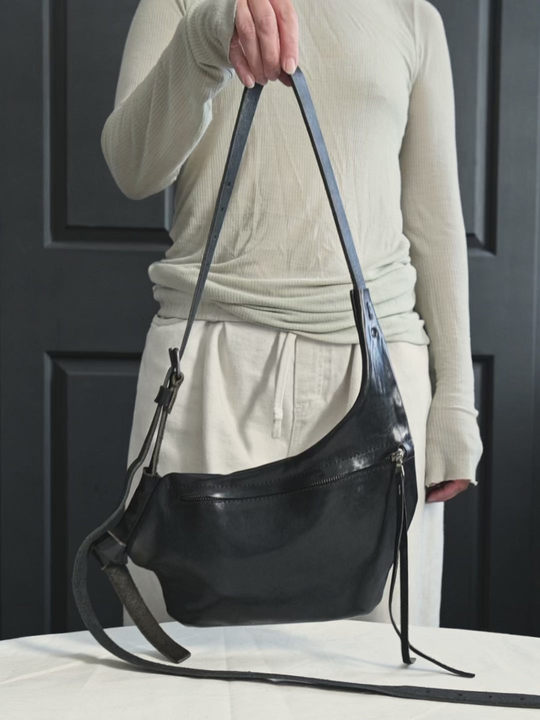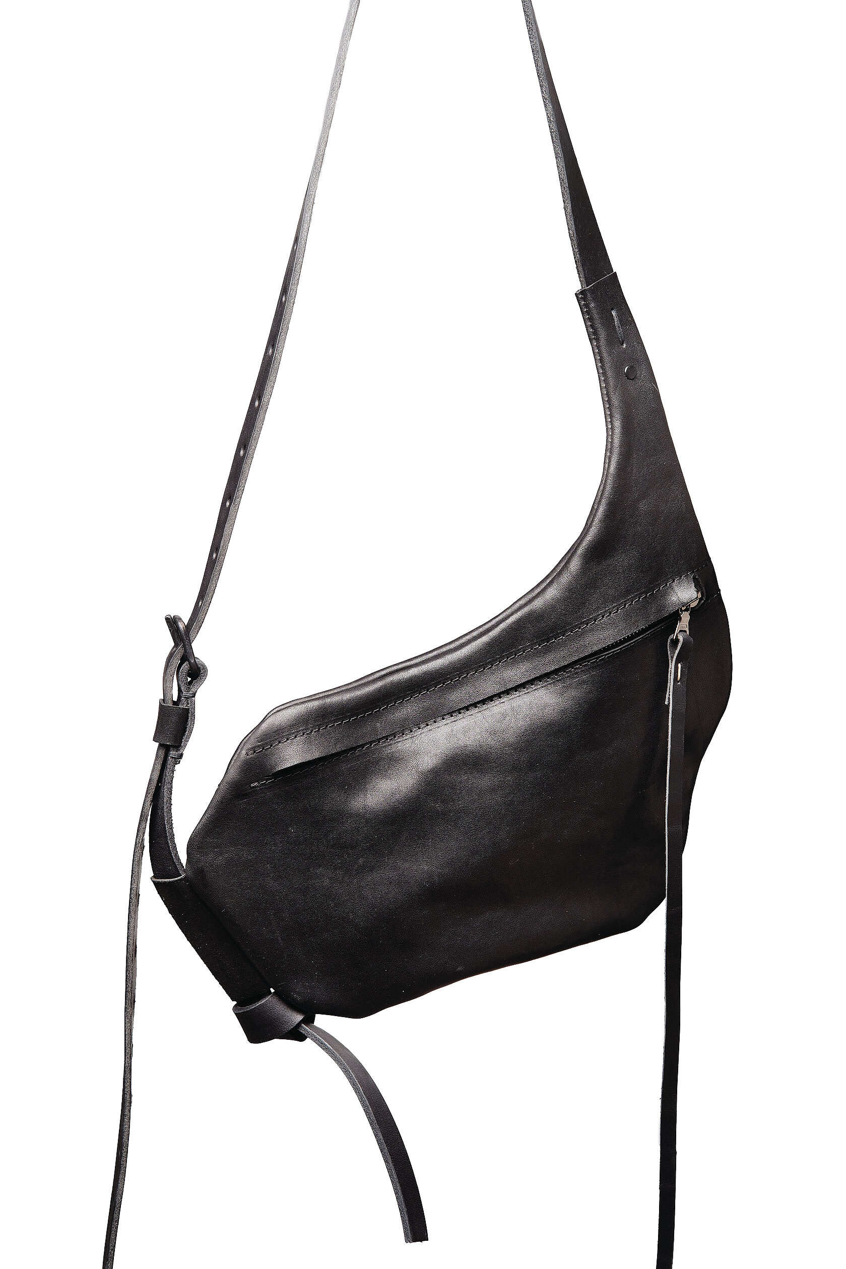 Ihre ergonomische Form schmiegt sich wie eine zweite Haut an den Körper – funktional, skulptural und sofort erkennbar. Die Tasche ist aus hochwertigen Materialien gefertigt und vollständig von Hand genäht. Sie verfügt über ein mit gewachster Baumwolle gefüttertes Hauptfach, einen Reißverschluss mit Lederlaschen und eine einzelne Innentasche mit Reißverschluss.