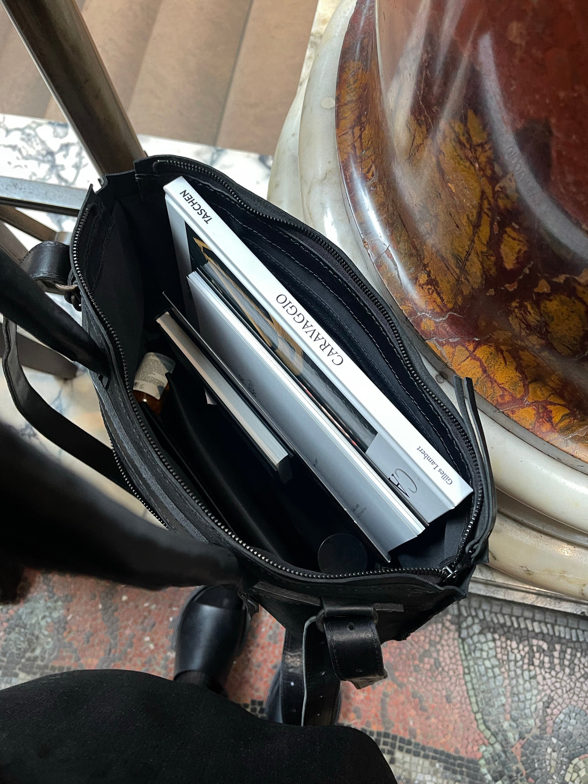Sie verfügt über ein geräumiges, komplett mit Leder gefüttertes Hauptfach mit Reißverschluss, eine große Innentasche mit Reißverschluss (17 × 20 cm) und eine zusätzliche Reißverschlusstasche auf der Rückseite der Tasche.
