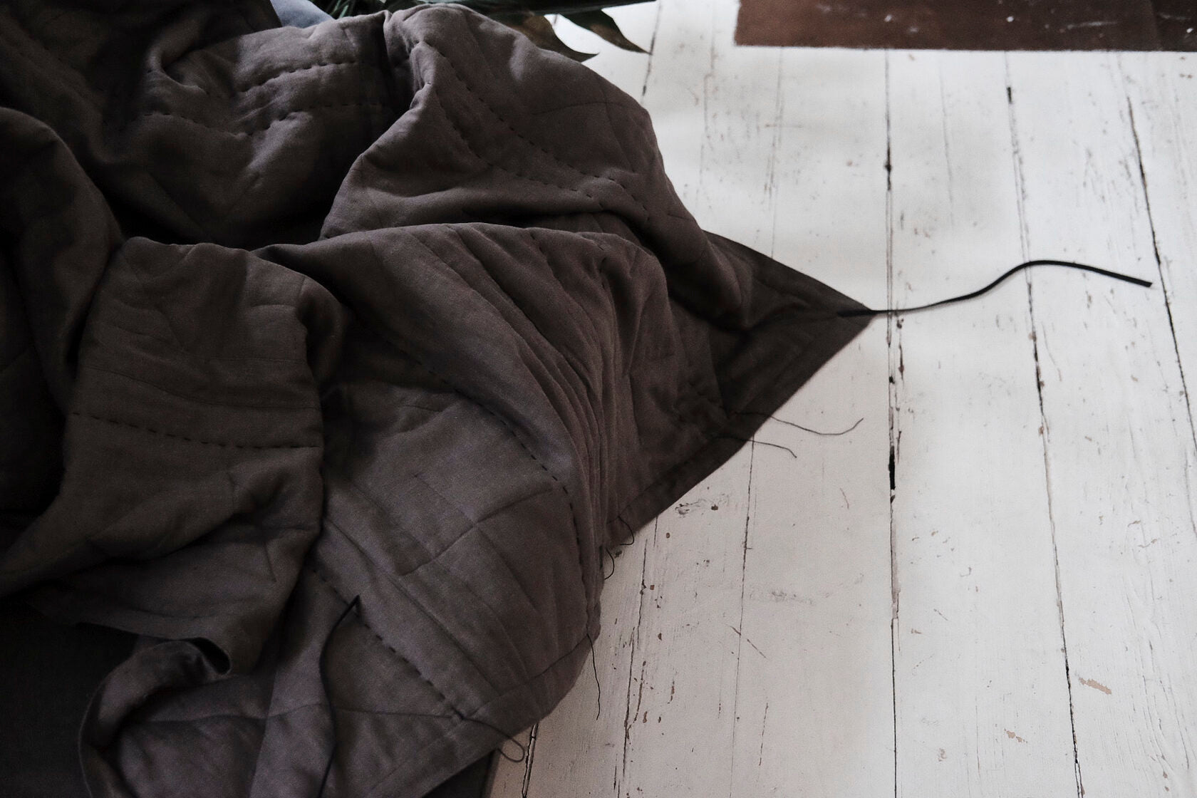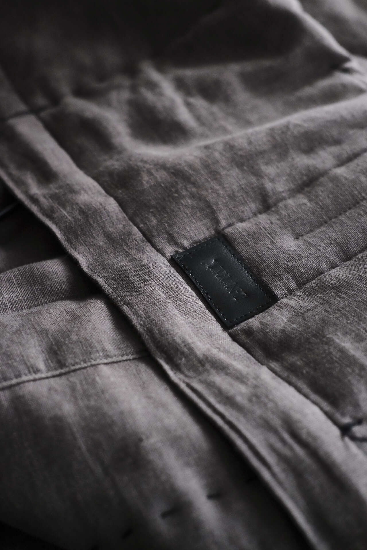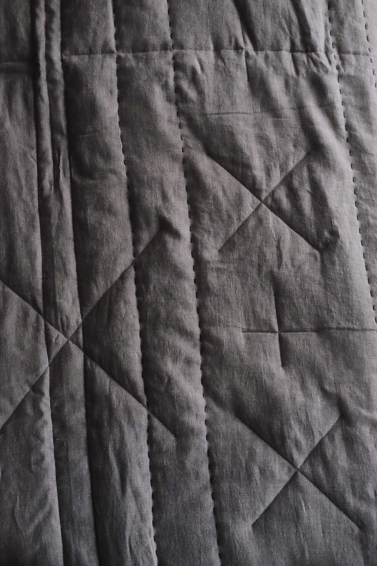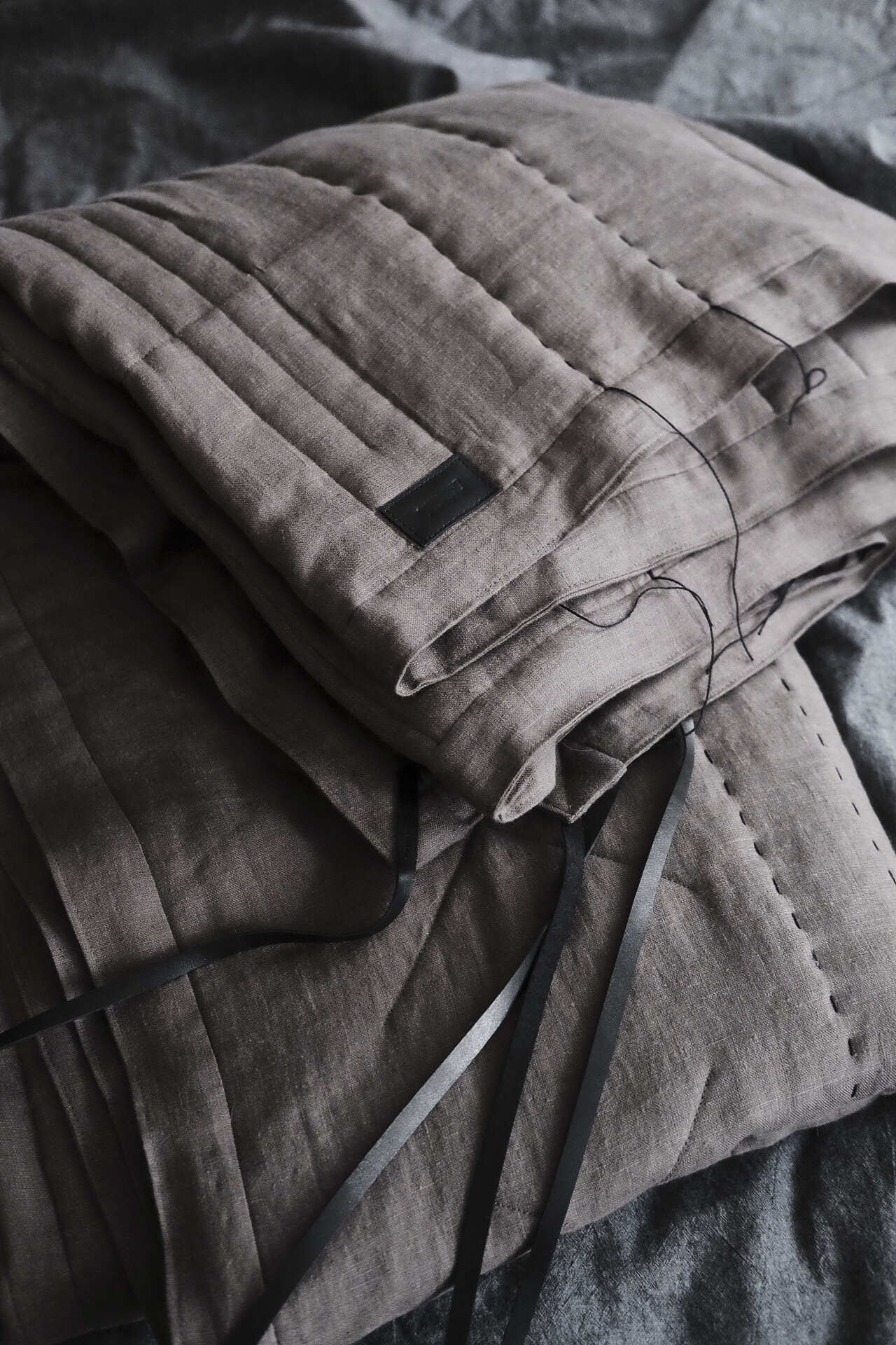 Eine gesteppte Decke aus lettischem Leinen mit Polyesterwattierung, ausgewählt aufgrund ihrer Leichtigkeit, hypoallergenen Eigenschaften und geruchsneutralen Qualität. Die Decke ist mit einem individuellen Kreuzmuster bestickt und mit Baumwollfaden handgesteppt. Die Enden der Decke sind mit Lederschnüren verziert. Das Gewicht der Decke wird durch die natürlichen Leinen- und Lederelemente bestimmt. Ein schönes und praktisches Accessoire für den Innenraum, das Wärme und Komfort spendet.