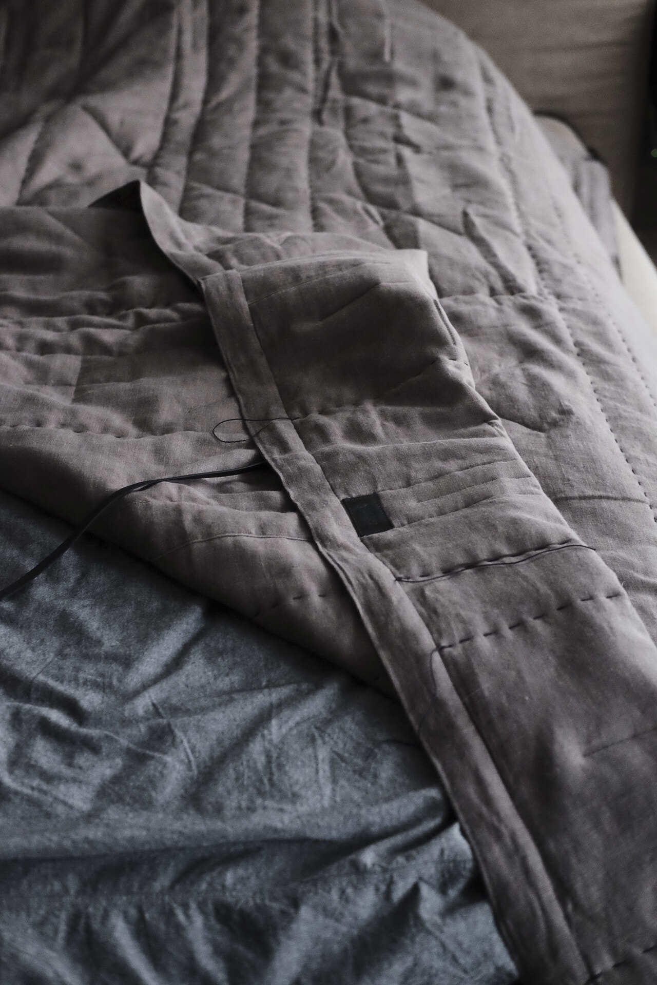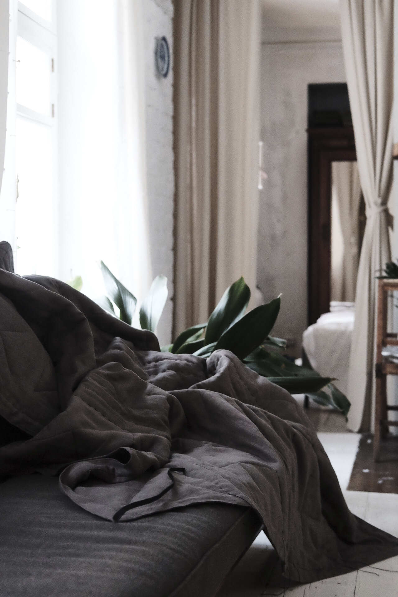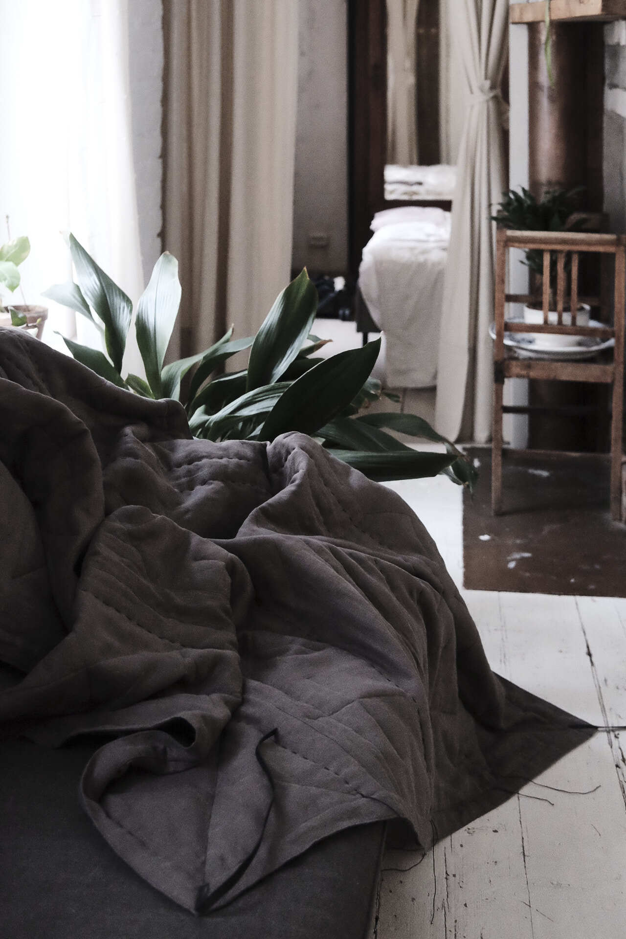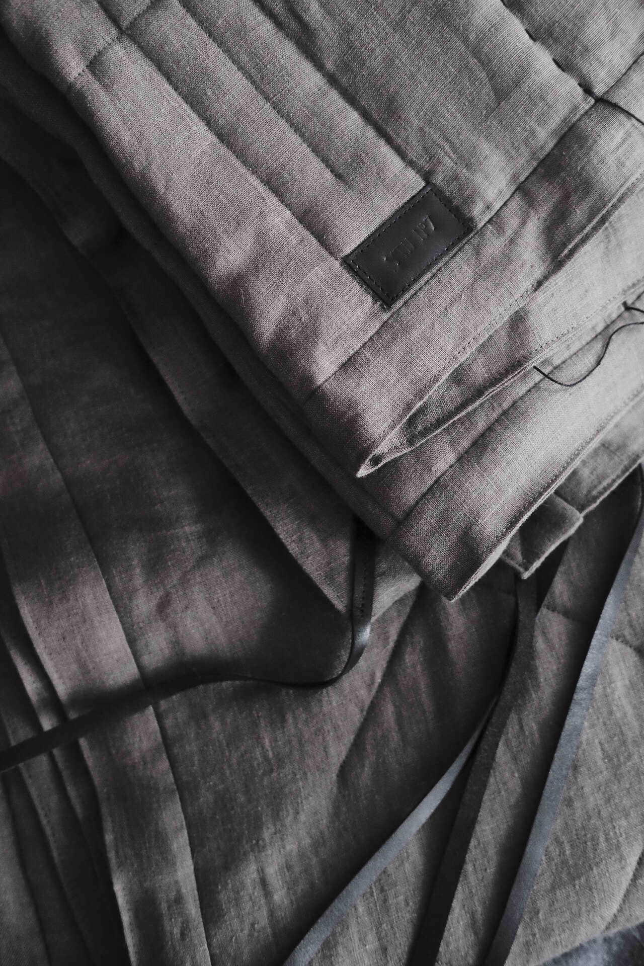 Eine gesteppte Decke aus lettischem Leinen mit Polyesterwattierung, ausgewählt aufgrund ihrer Leichtigkeit, hypoallergenen Eigenschaften und geruchsneutralen Qualität. Die Decke ist mit einem individuellen Kreuzmuster bestickt und mit Baumwollfaden handgesteppt. Die Enden der Decke sind mit Lederschnüren verziert. Das Gewicht der Decke wird durch die natürlichen Leinen- und Lederelemente bestimmt. Ein schönes und praktisches Accessoire für den Innenraum, das Wärme und Komfort spendet.