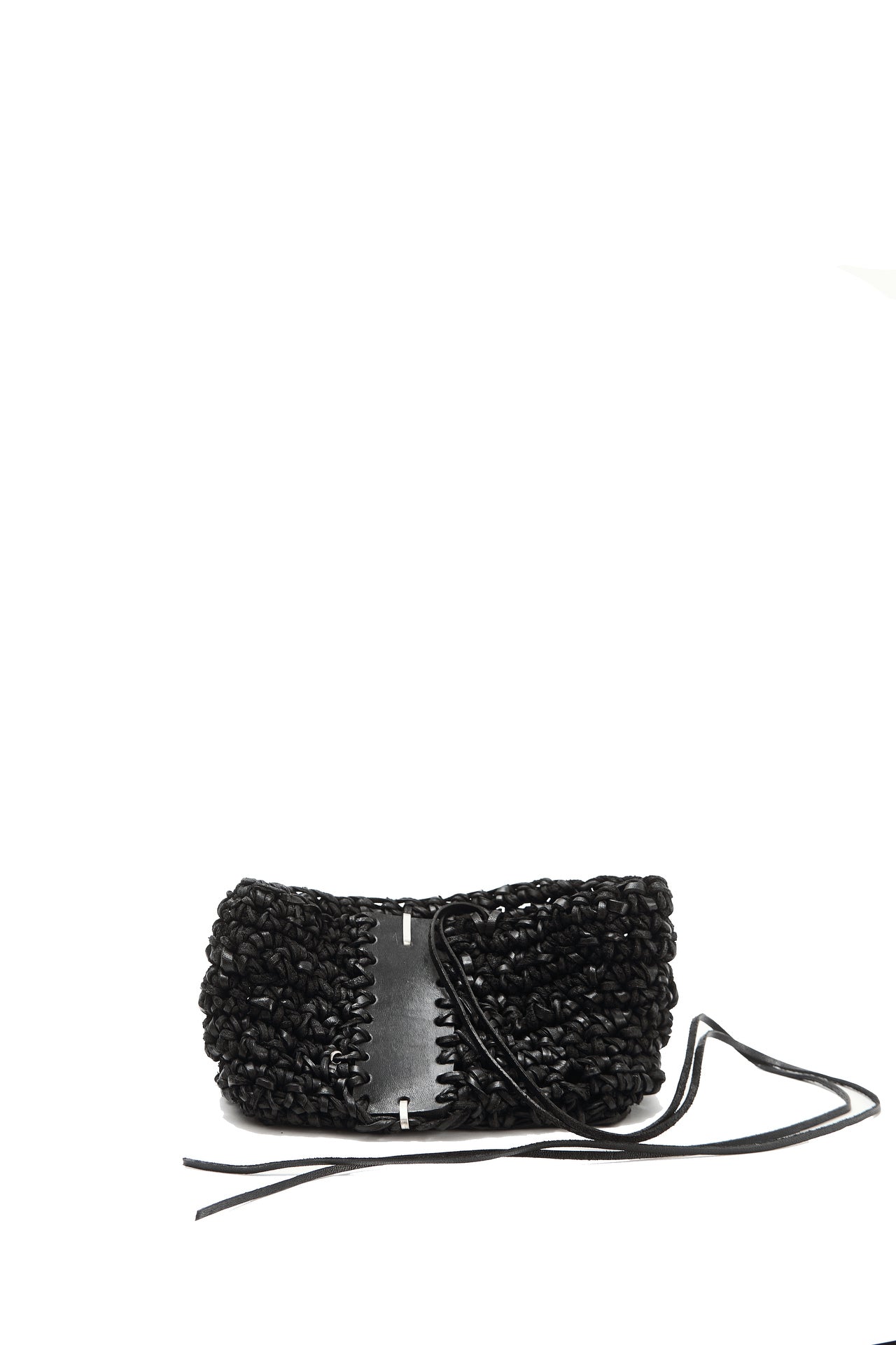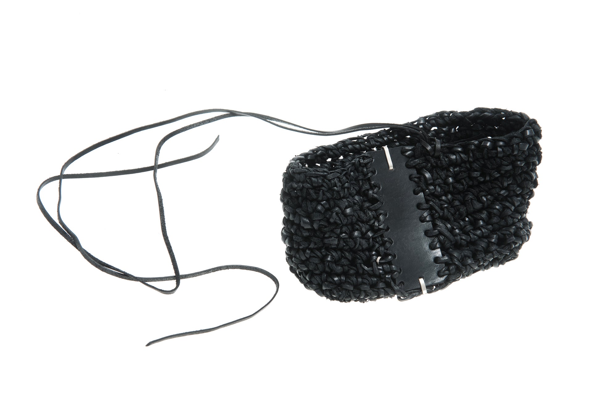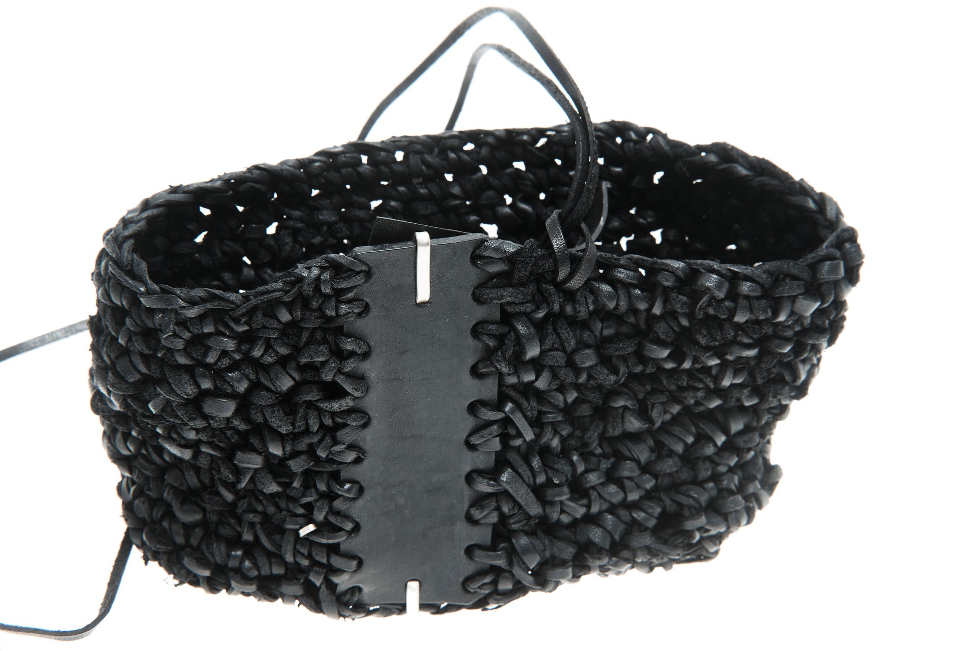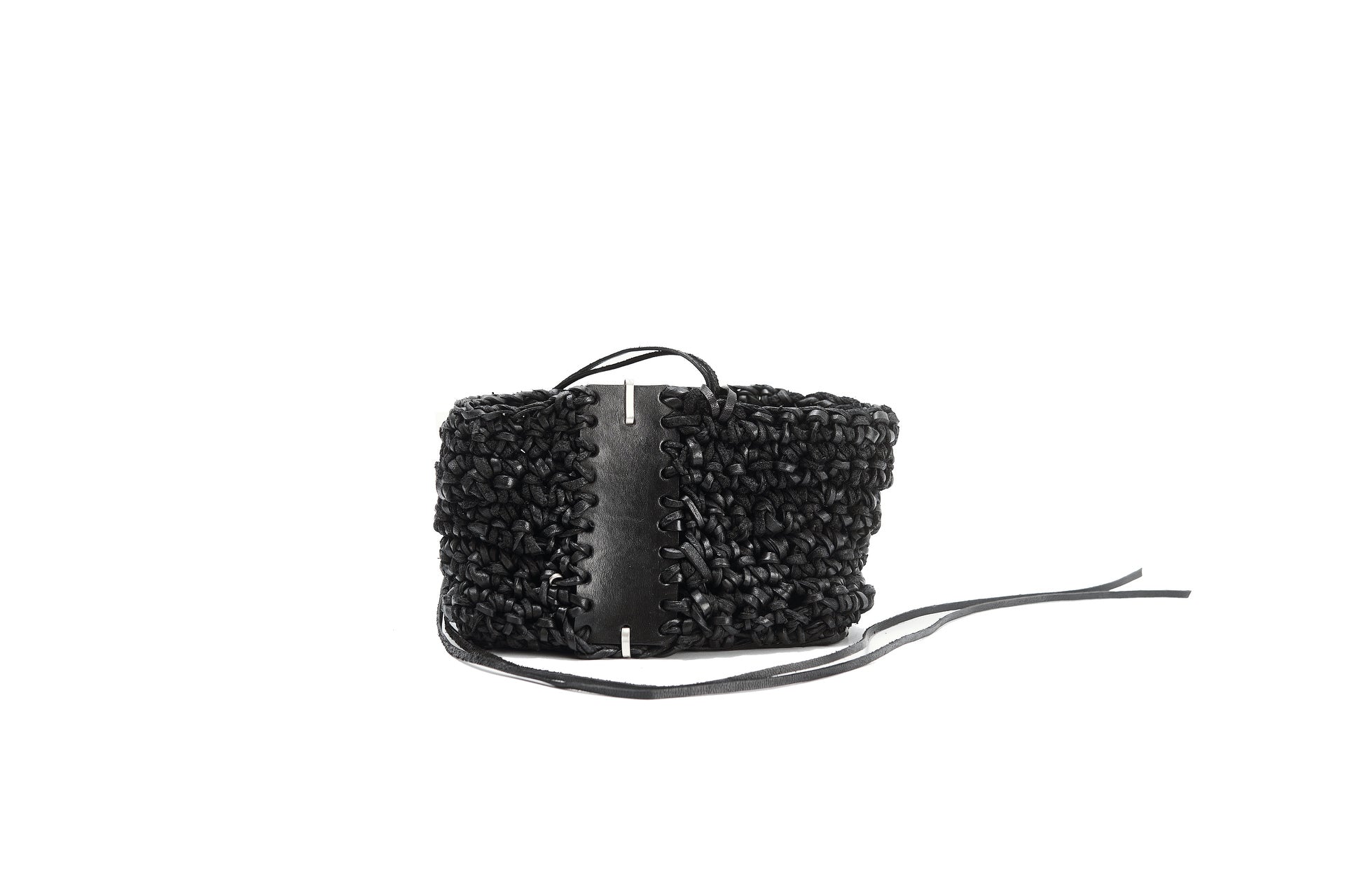 一つ一つの箱は、ロシアに住む祖母が余った革を手作業で切り抜き、手編みで仕上げています。ロンドンのスタジオで組み立て、黒に染め、防水加工を施しています。厚みのあるしっかりとした革のベースに、ニッケルシルバーのアクセントをあしらったこの箱は、機能的な収納アイテムとしてデザインされています。