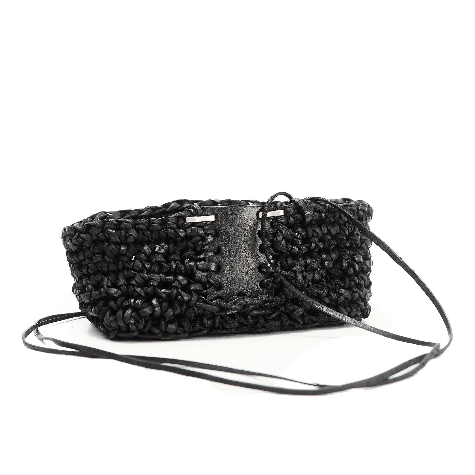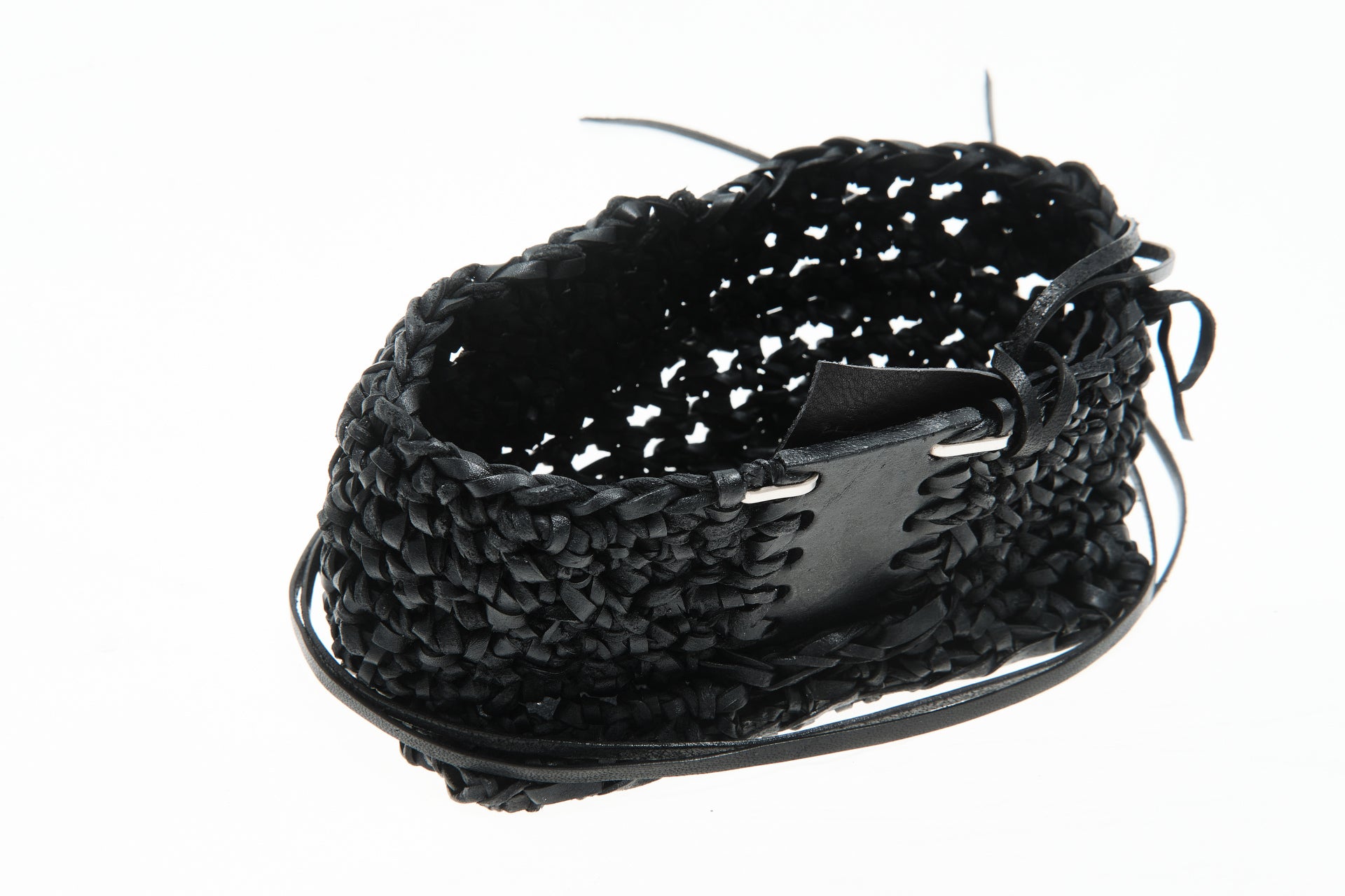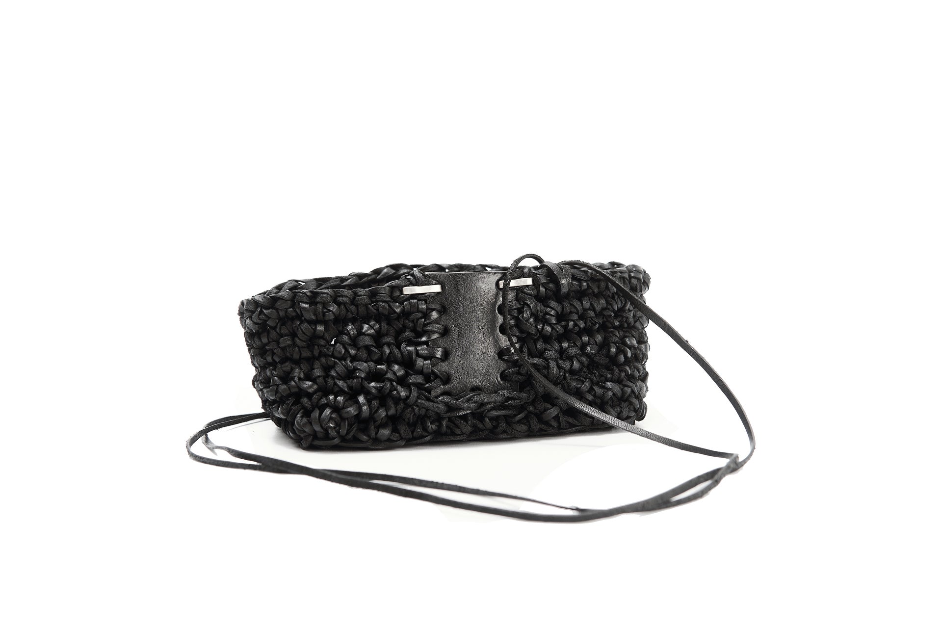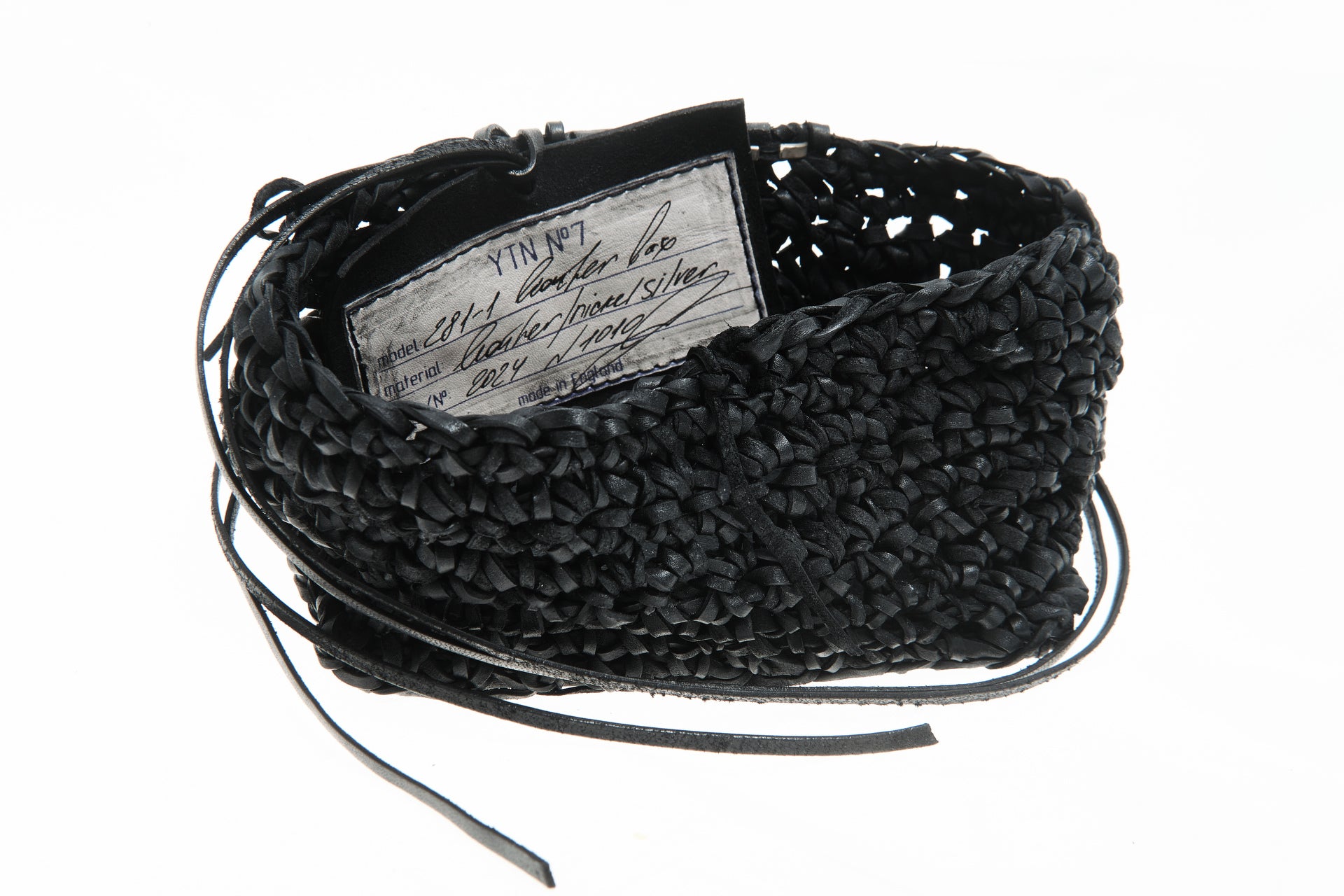 一つ一つの箱は、ロシアに住む祖母が余った革を手作業で切り抜き、手編みで仕上げています。ロンドンのスタジオで組み立て、黒に染め、防水加工を施しています。厚みのあるしっかりとした革のベースに、ニッケルシルバーのアクセントをあしらったこの箱は、機能的な収納アイテムとしてデザインされています。