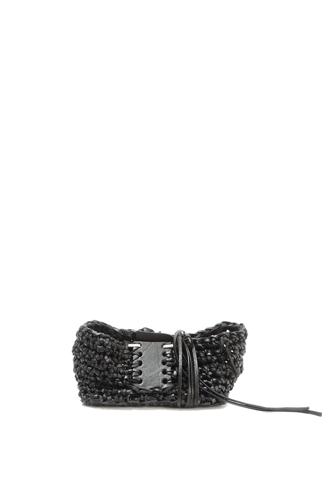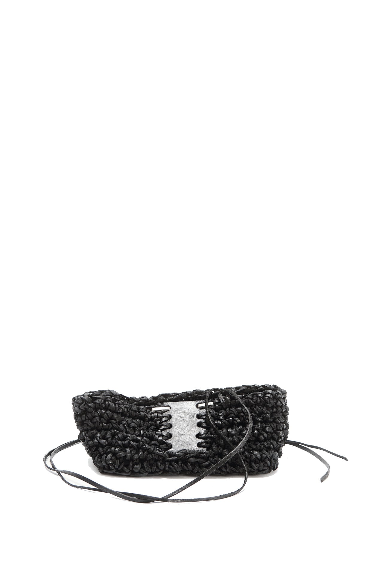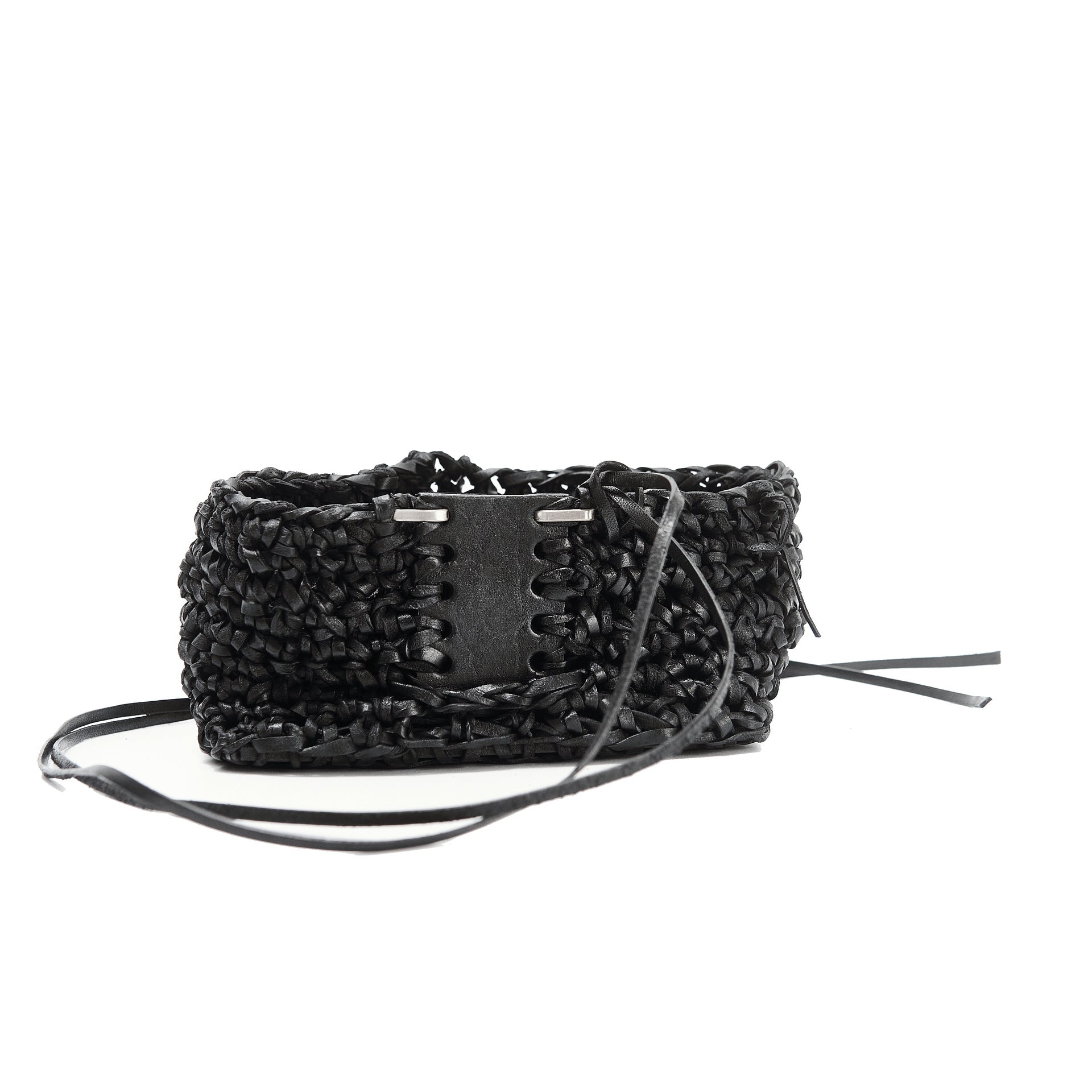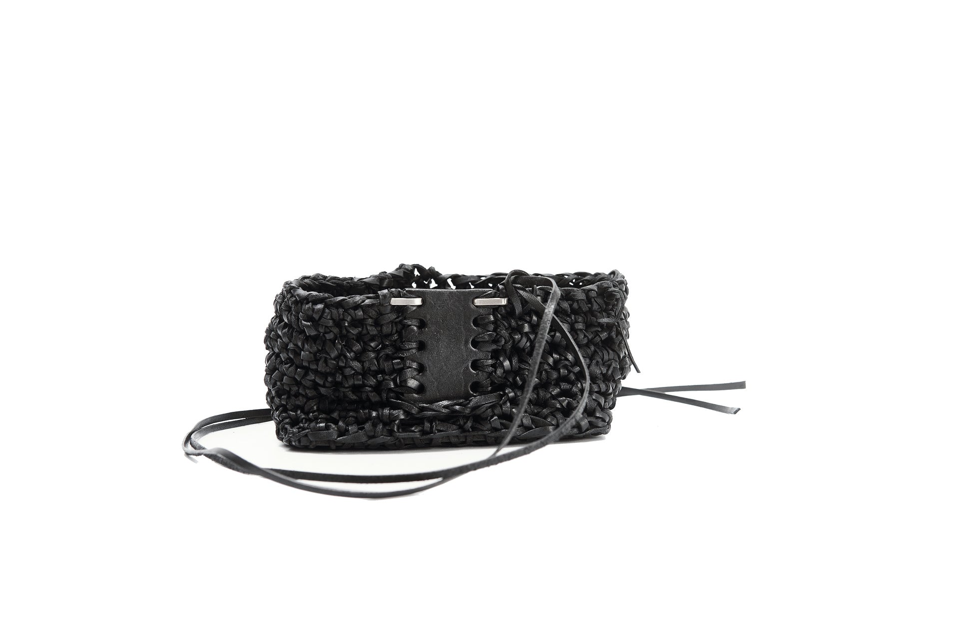 一つ一つの箱は、ロシアに住む祖母が余った革を手作業で切り抜き、手編みで仕上げています。ロンドンのスタジオで組み立て、黒に染め、防水加工を施しています。厚みのあるしっかりとした革のベースに、ニッケルシルバーのアクセントをあしらったこの箱は、機能的な収納アイテムとしてデザインされています。