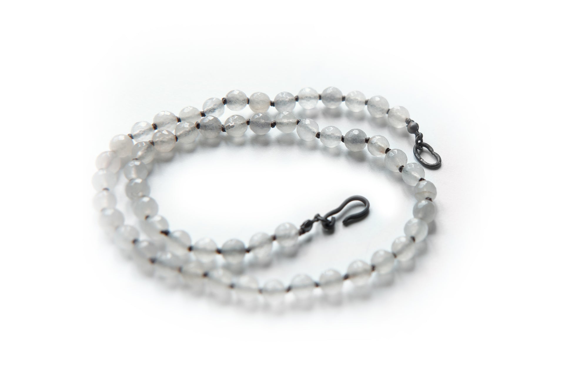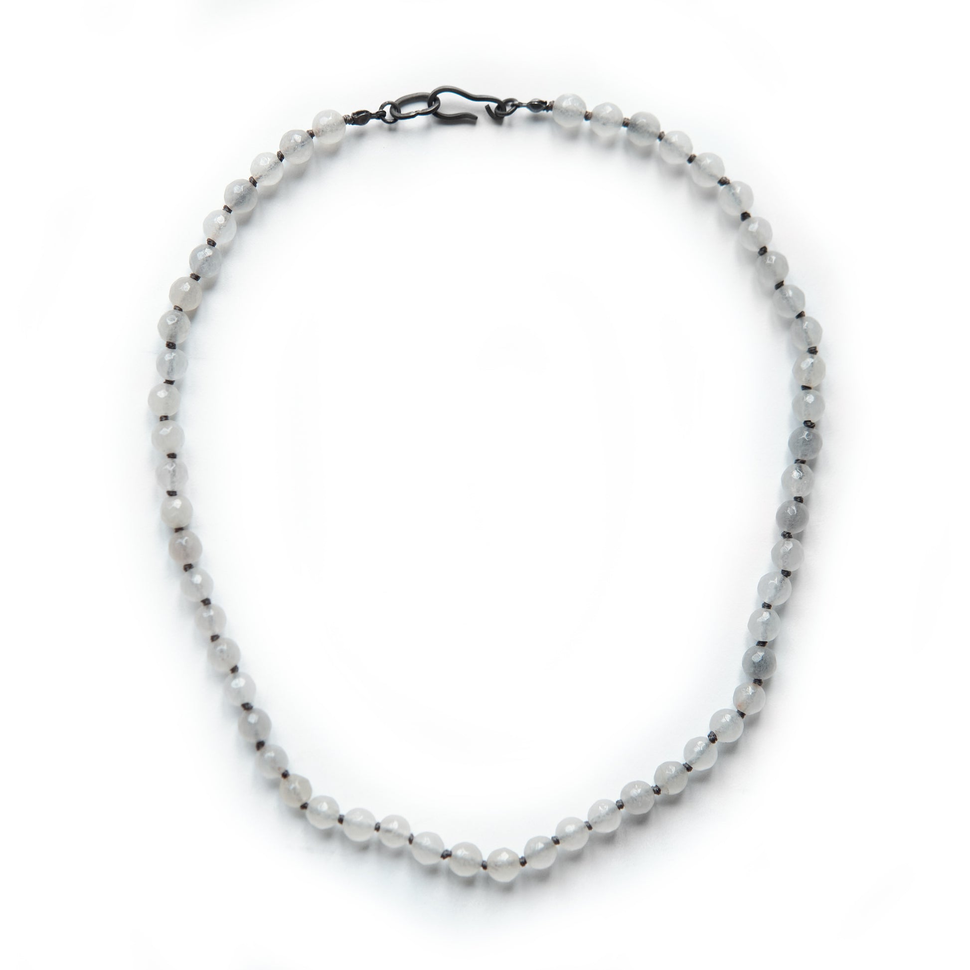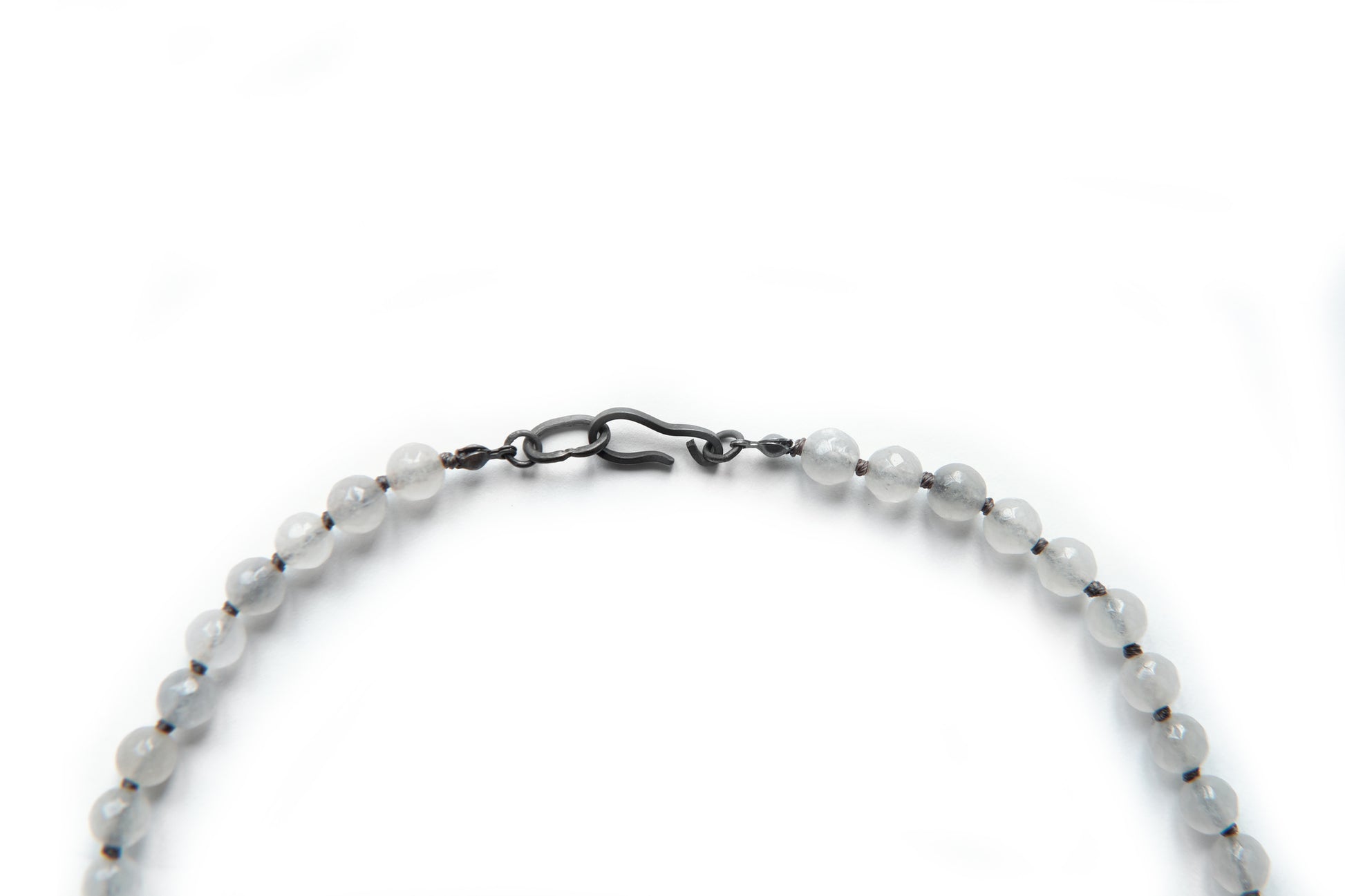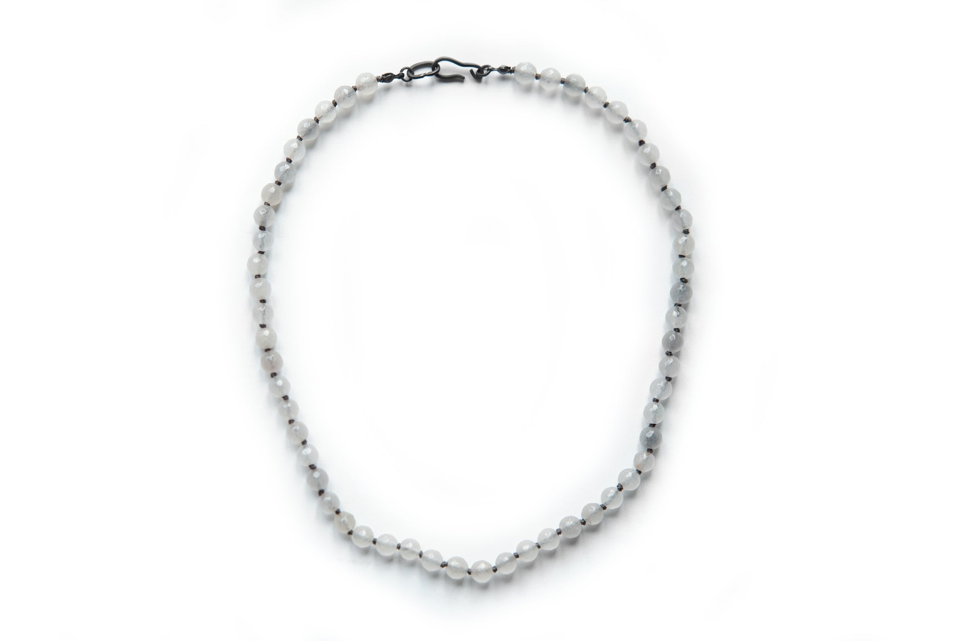 ダークブラッドストーンビーズを一つ一つスターリングシルバーのノットで繋ぎ合わせたネックレスです。4mm径のリングが付いたソリッドスターリングシルバーチェーンに小さなビーズをあしらい、フィット感を調節して快適な着け心地を実現。手作業で成形されたスターリングシルバーのフッククラスプでしっかりと留めます。