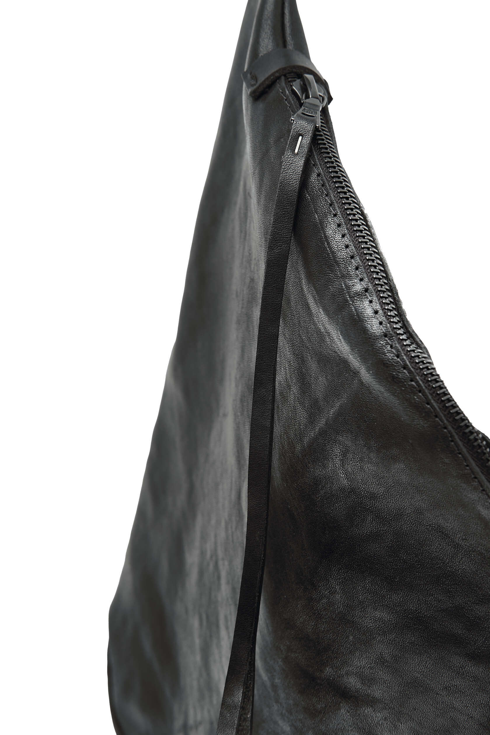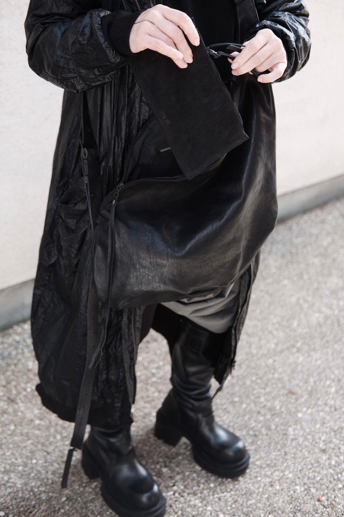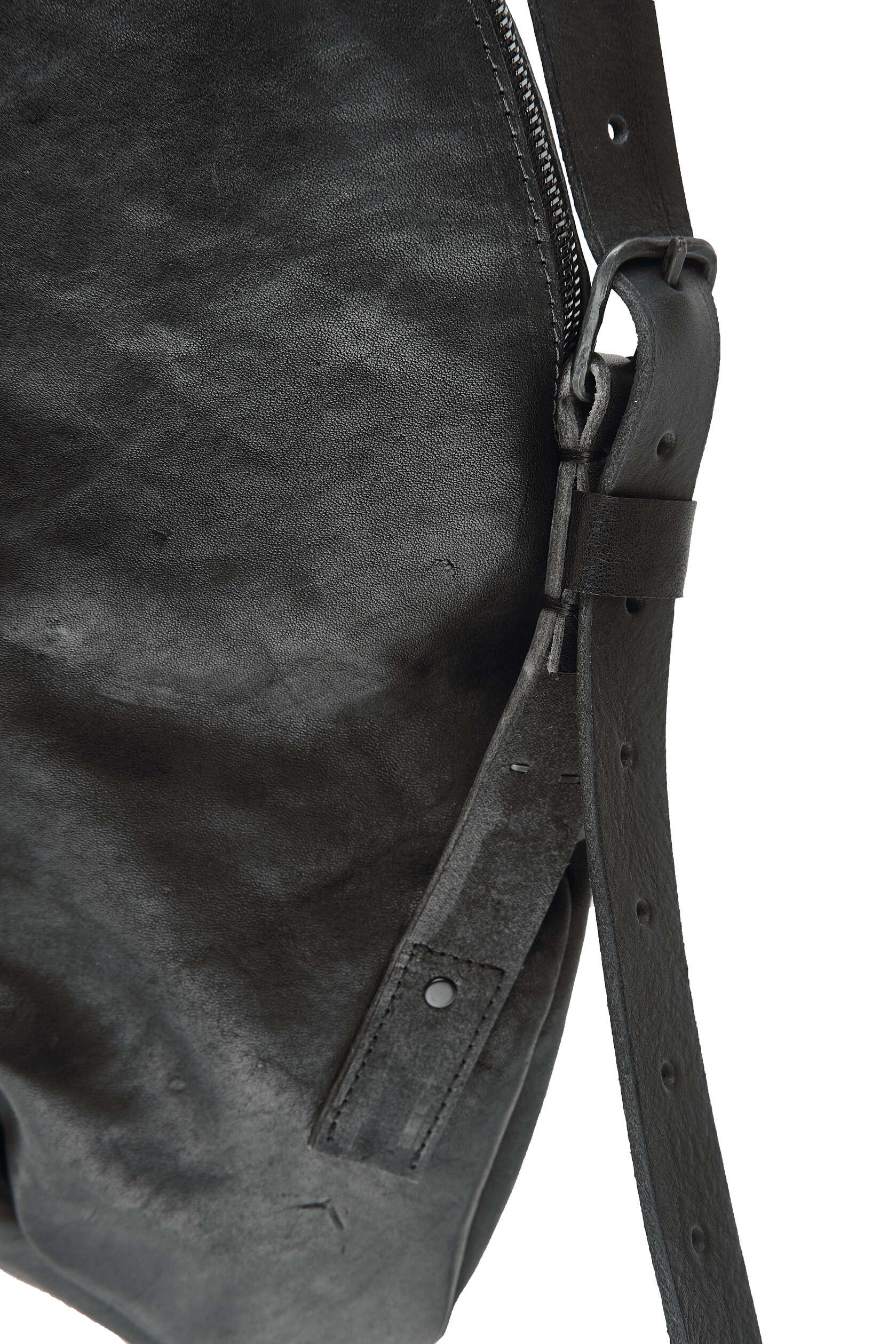 Inside, a single welt zip pocket keeps essentials organized, while a detachable leather clutch adds versatility to the design. The adjustable shoulder strap is anchored with custom-forged blued steel hardware, unique to the brand. Each detail is executed by hand, ensuring longevity and distinct character.