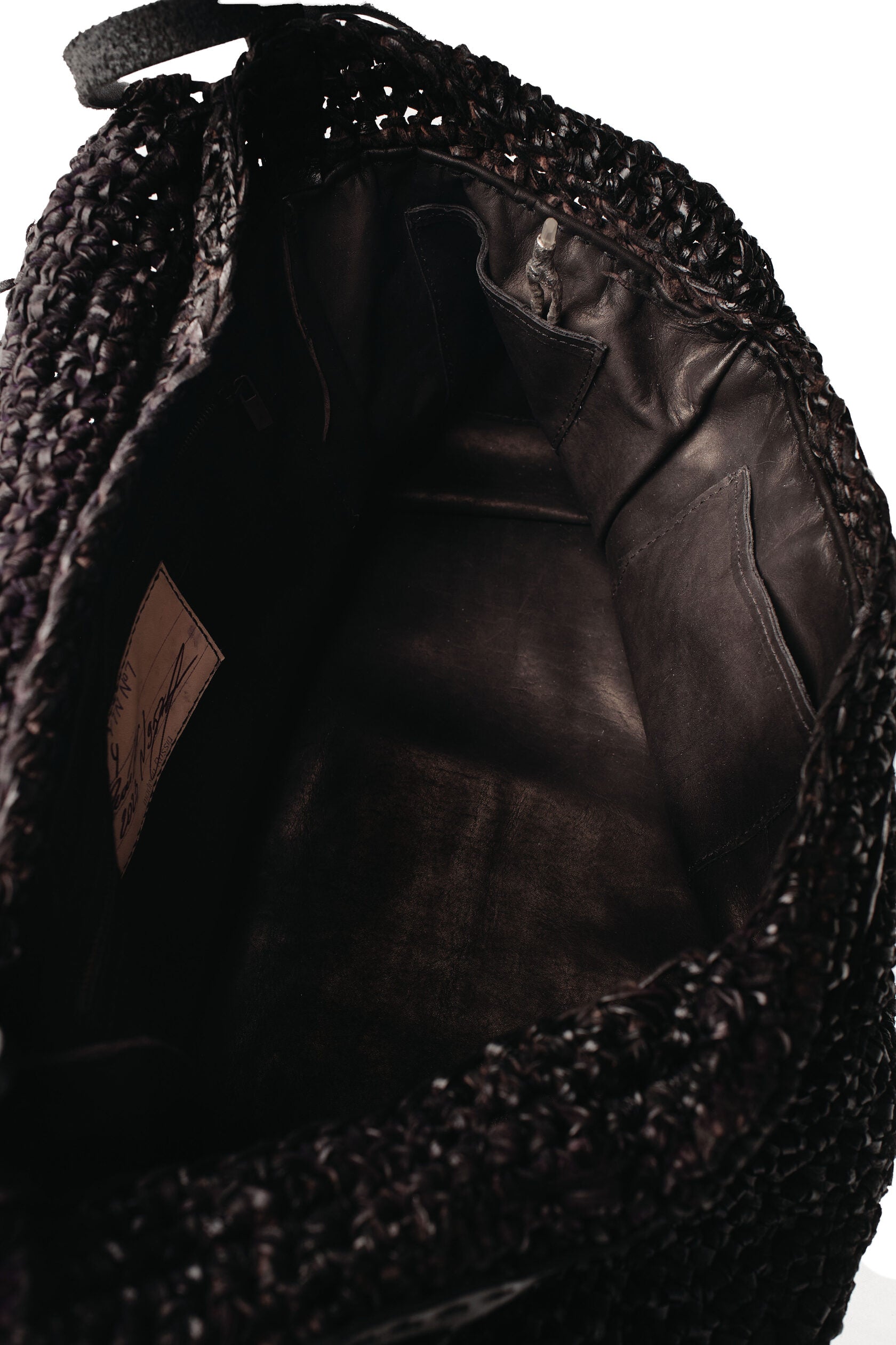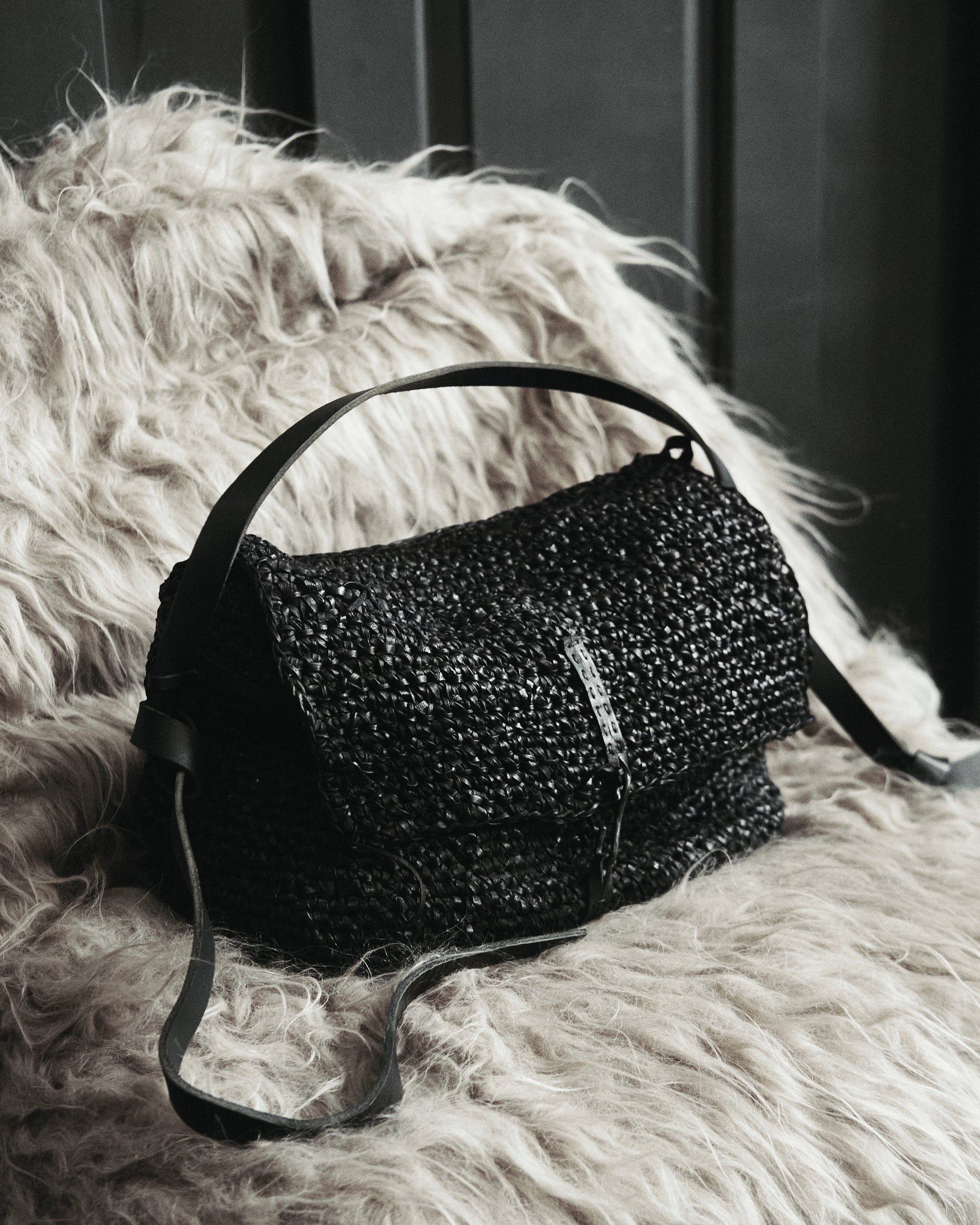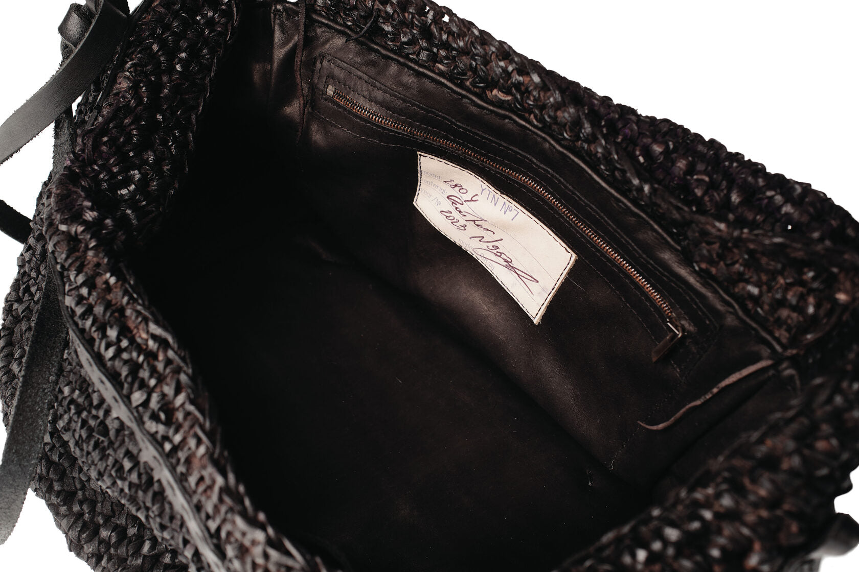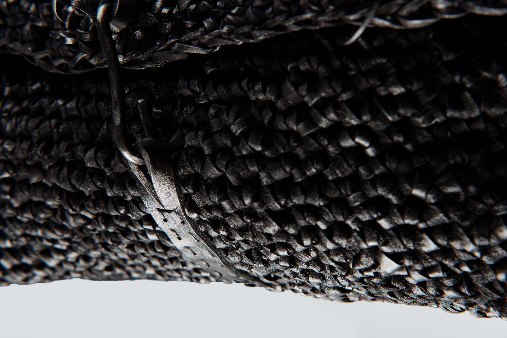 This large leather bag-box is hand-cut from leftover leather and hand-knitted by my grandmother in Russia. It is assembled, dyed by hand in deep, uneven shades of black, and treated for water resistance in our London studio. Built on a reinforced leather base, it features a waxed leather lining with small interior pockets and closes securely with a custom-forged steel hook. It carries the quiet mark of time, craftsmanship, and care.