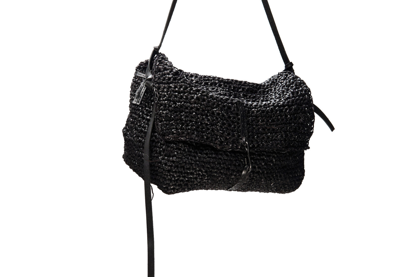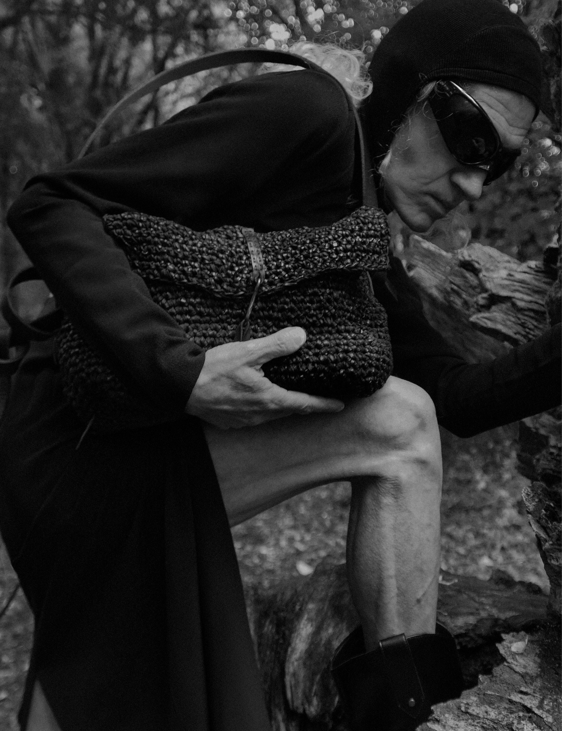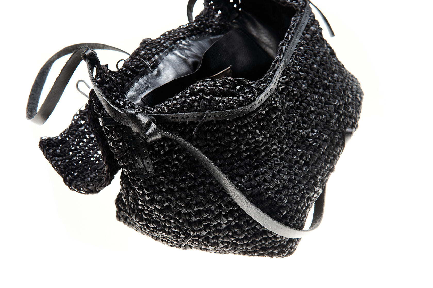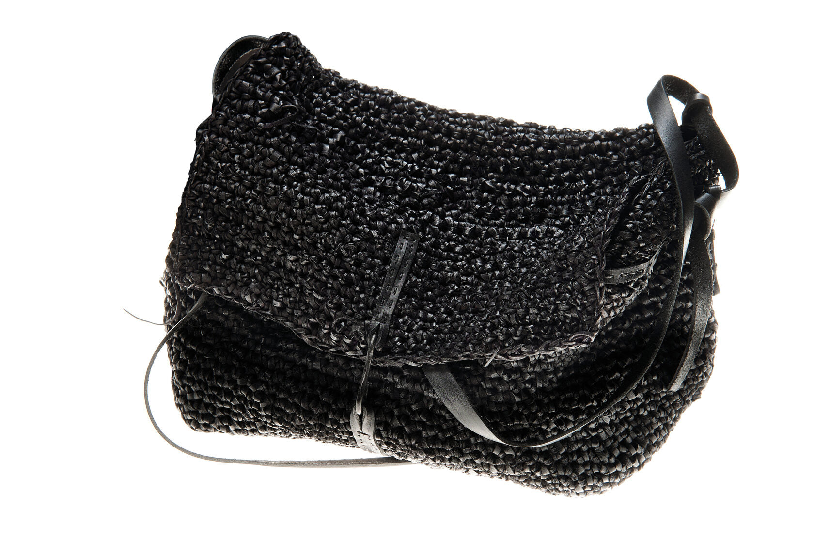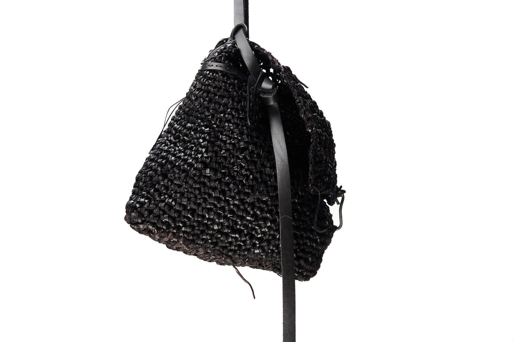 This large leather bag-box is hand-cut from leftover leather and hand-knitted by my grandmother in Russia. It is assembled, dyed by hand in deep, uneven shades of black, and treated for water resistance in our London studio. Built on a reinforced leather base, it features a waxed leather lining with small interior pockets and closes securely with a custom-forged steel hook. It carries the quiet mark of time, craftsmanship, and care.