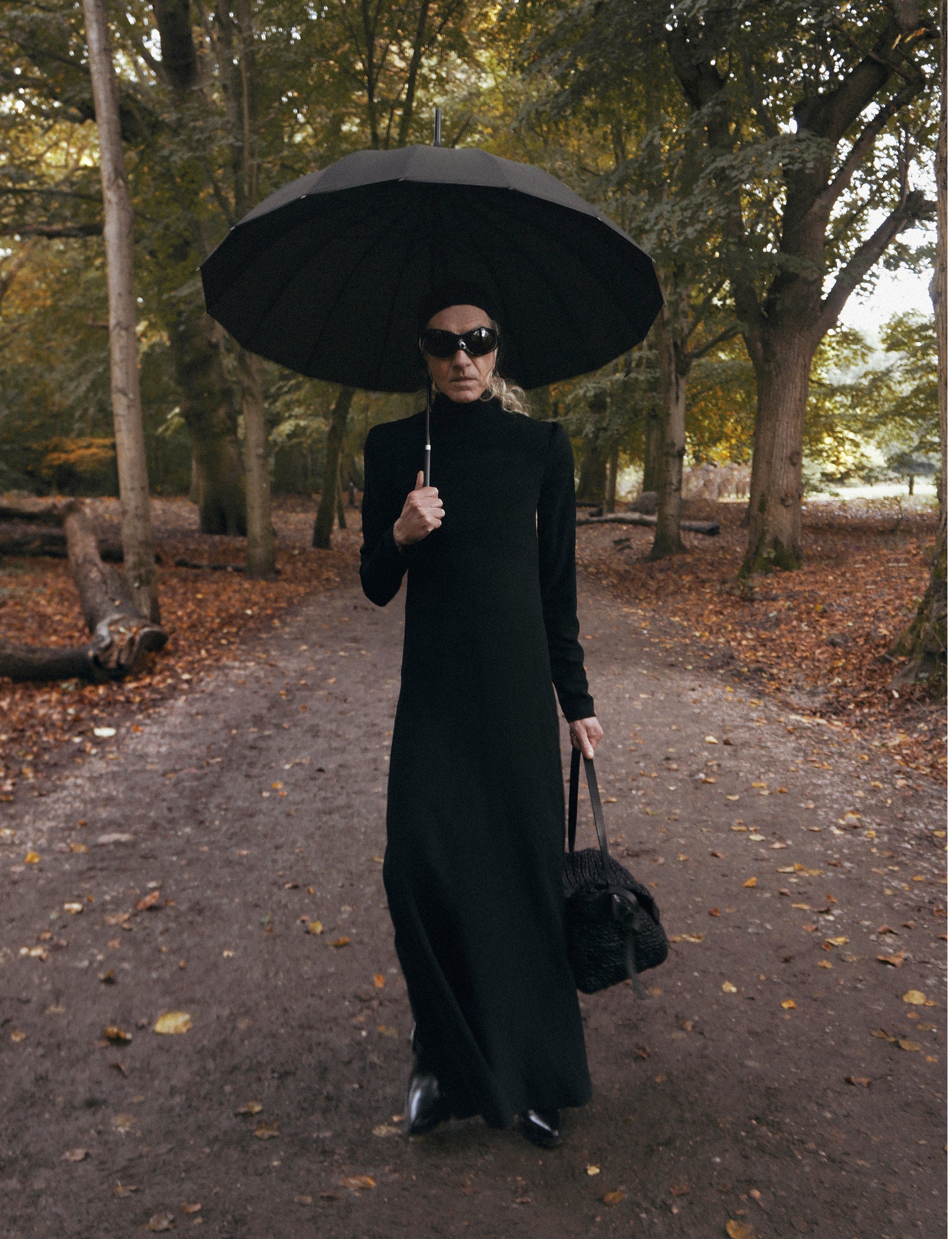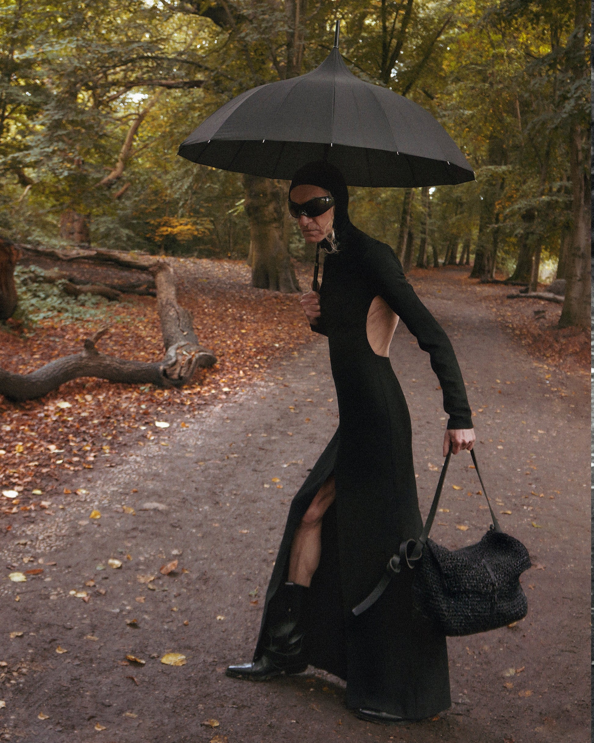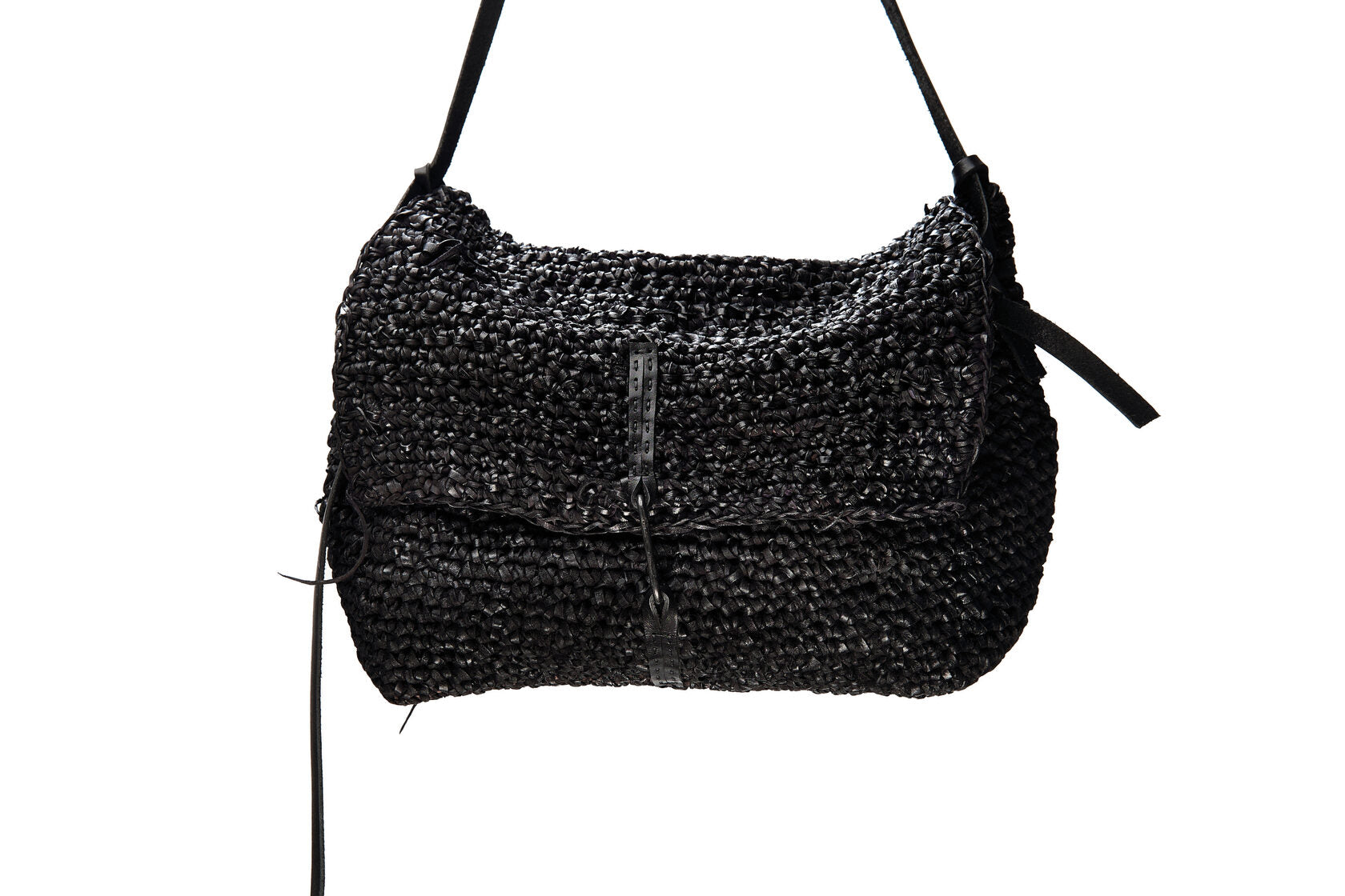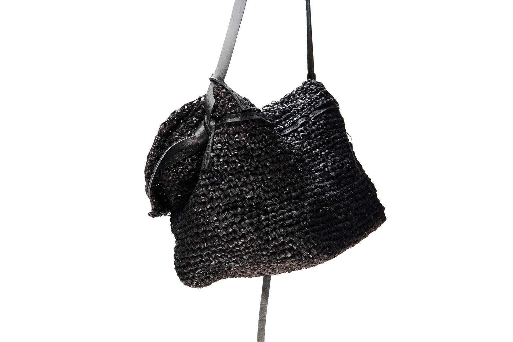 This large leather bag-box is hand-cut from leftover leather and hand-knitted by my grandmother in Russia. It is assembled, dyed by hand in deep, uneven shades of black, and treated for water resistance in our London studio. Built on a reinforced leather base, it features a waxed leather lining with small interior pockets and closes securely with a custom-forged steel hook. It carries the quiet mark of time, craftsmanship, and care.