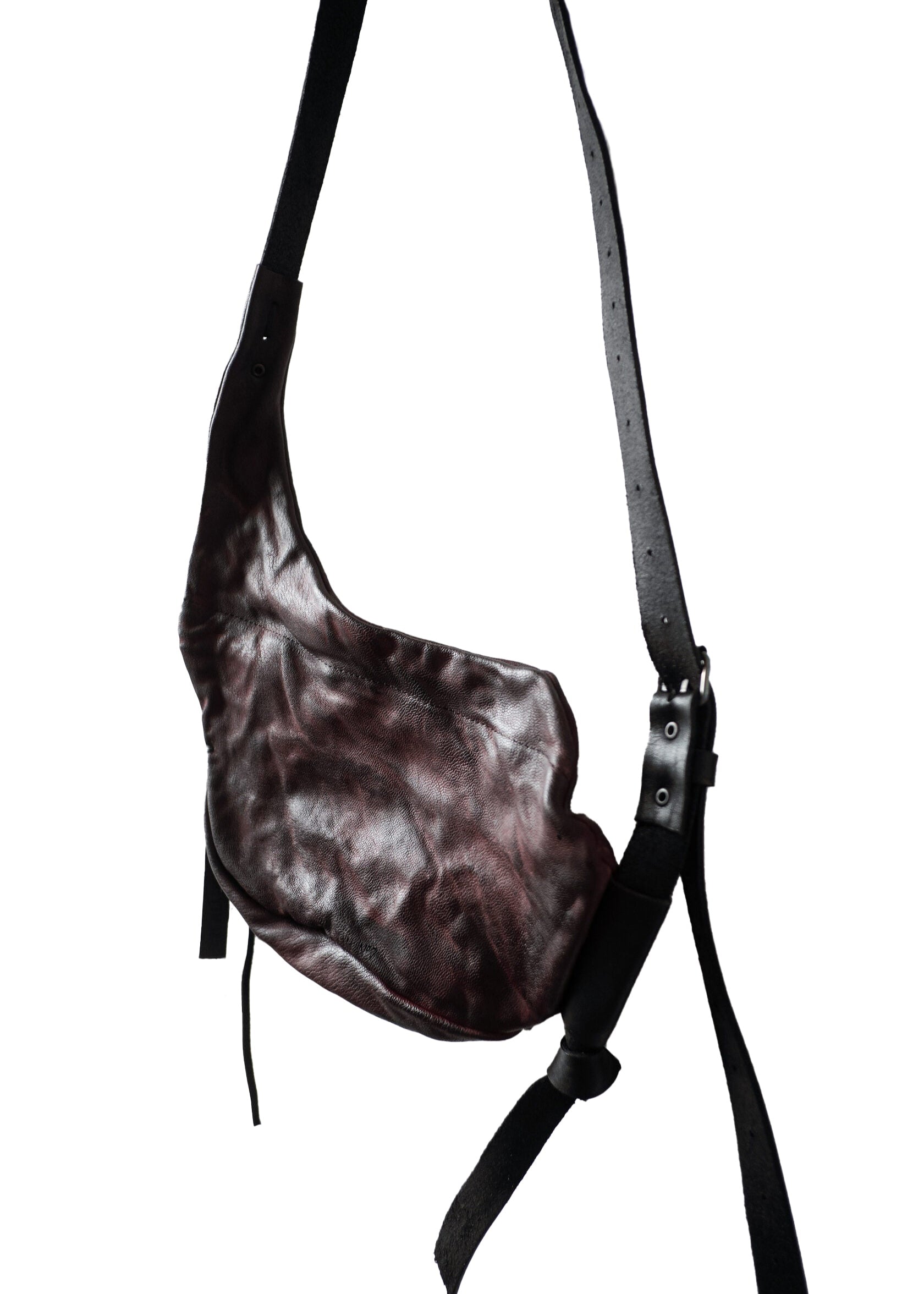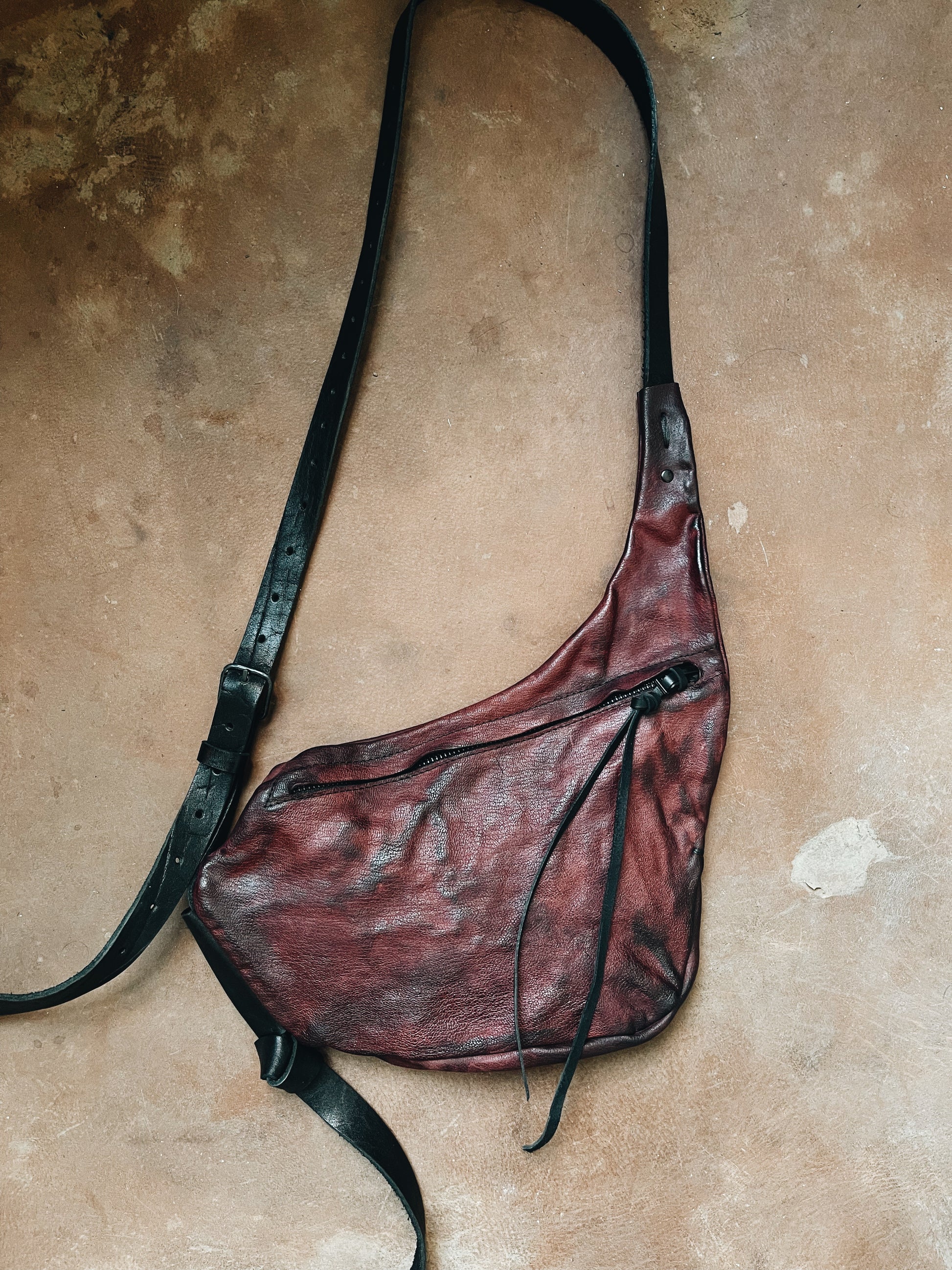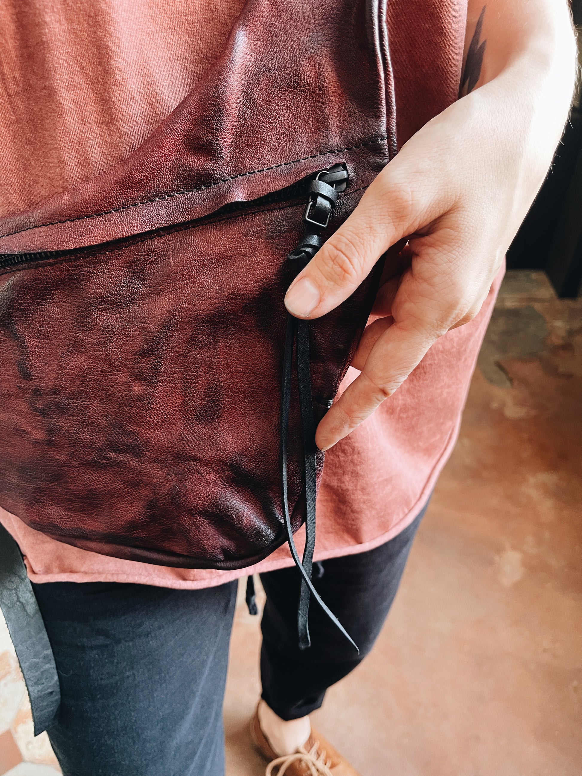 - Zipper closure with leather pulls